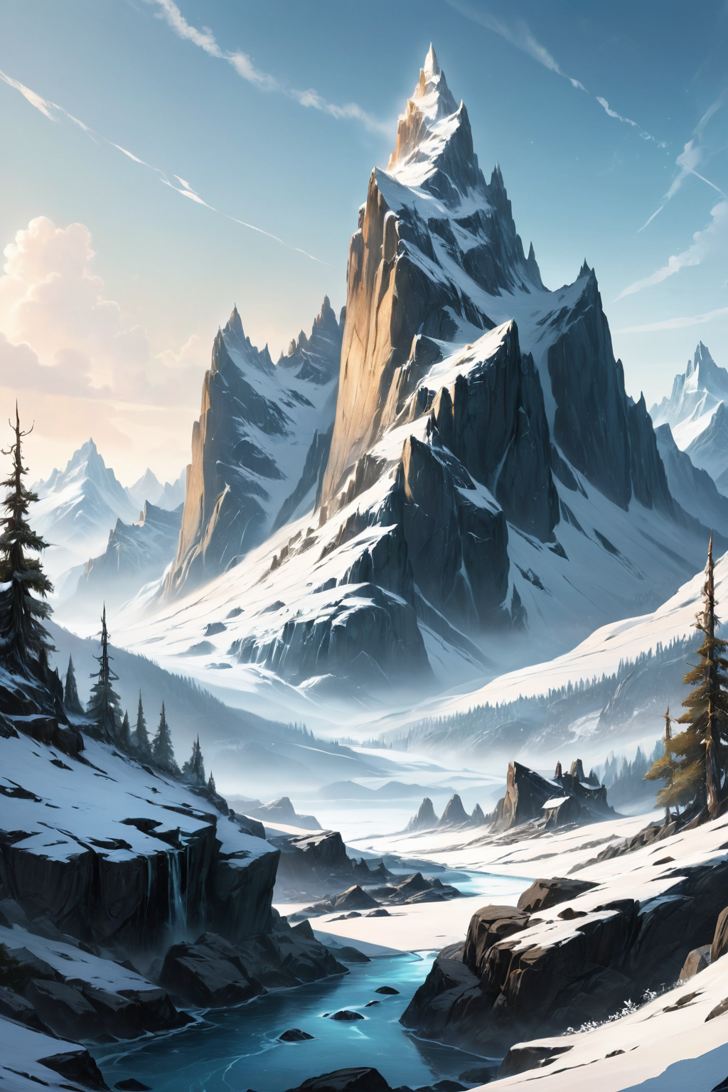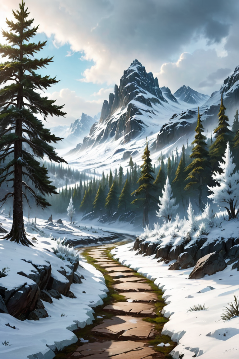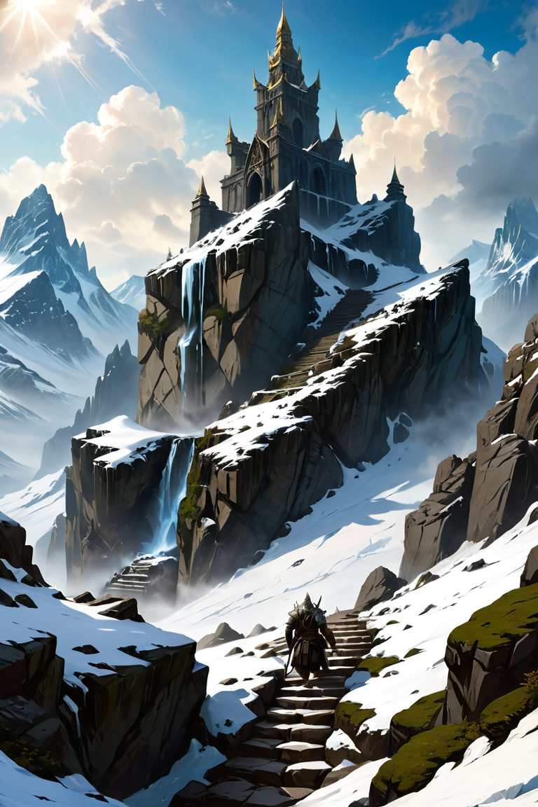 Ambient medieval western RPG soundtrack, subtle and supportive, Use only a few instruments: harp and celesta (or glockenspiel), Simple melodic motifs in Dorian or Mixolydian mode, flowing gently, Very slow, relaxed rhythms, Transparent, crystalline, and minimal texture, evoking the stillness of snow-covered mountains, Atmosphere calm, serene, and contemplative, evoking a quiet journey through the cold, snowy mountains near Solitude, The wind whispers through the peaks, snow crunches softly underfoot, and the landscape is vast, white, and peaceful, ‑piccolo, ‑high flute, ‑tin whistle, ‑soprano flute, ‑strings, ‑fiddle
