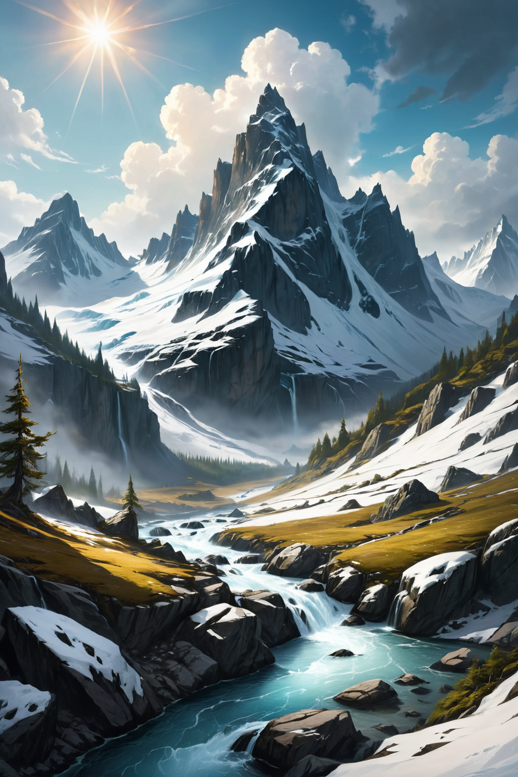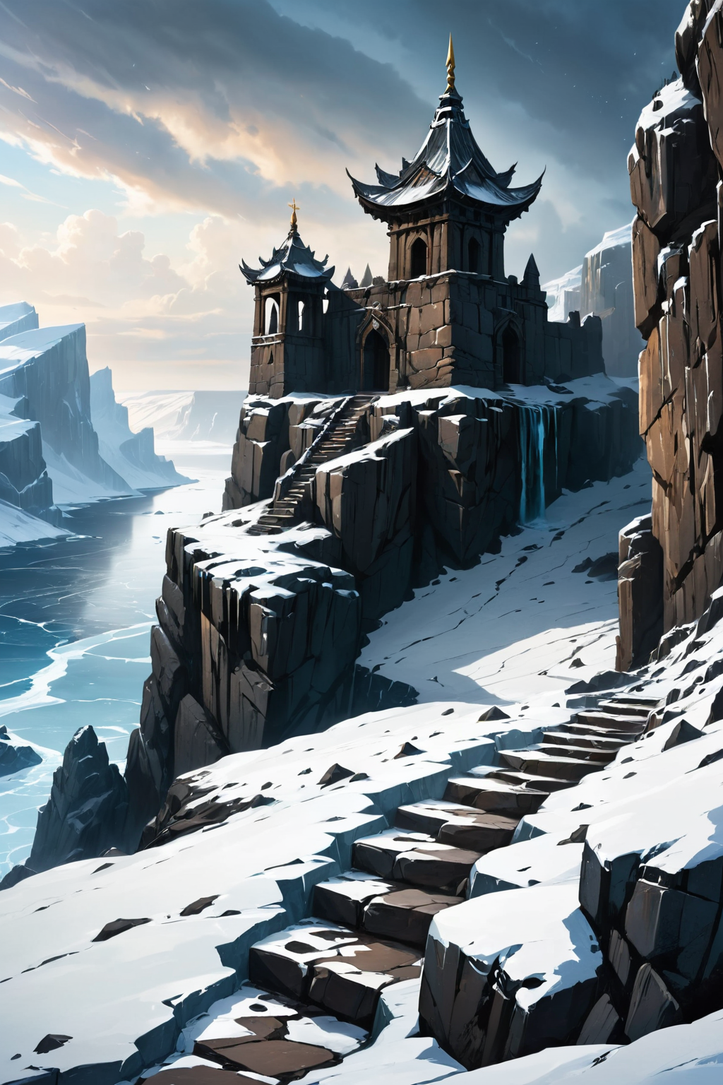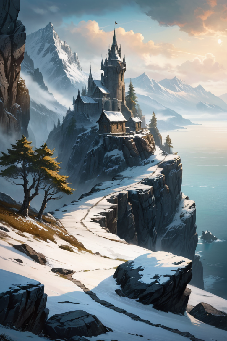 Ambient medieval western RPG soundtrack, subtle and supportive, Use only a few instruments: harp and celesta (or glockenspiel), Simple melodic motifs in Dorian or Mixolydian mode, flowing gently, Very slow, relaxed rhythms, Transparent, crystalline, and minimal texture, evoking the stillness of snow-covered mountains, Atmosphere calm, serene, and contemplative, evoking a quiet journey through the cold, snowy mountains near Solitude, The wind whispers through the peaks, snow crunches softly underfoot, and the landscape is vast, white, and peaceful, ‑piccolo, ‑high flute, ‑tin whistle, ‑soprano flute, ‑strings, ‑fiddle