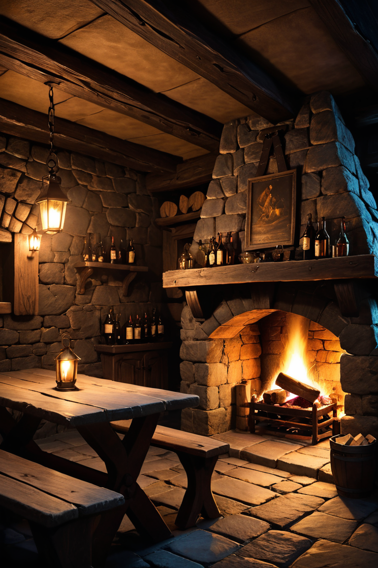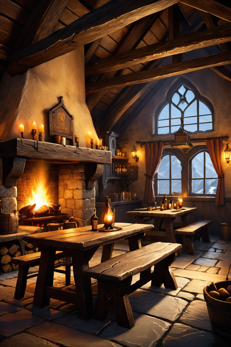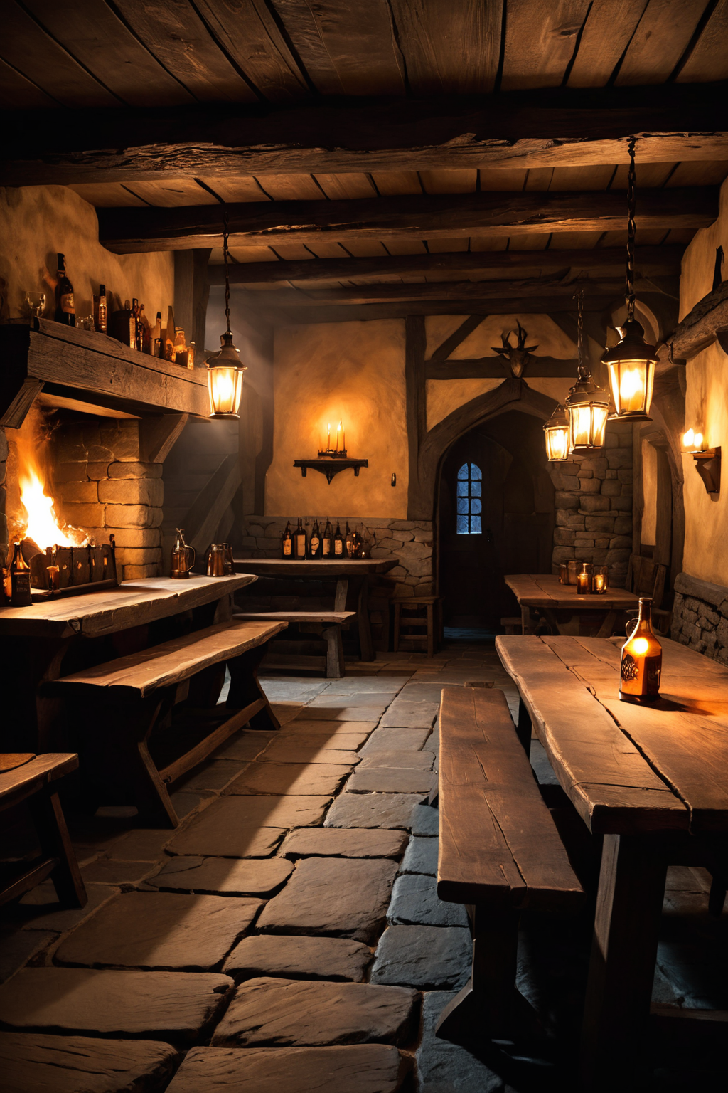 Ambient medieval western RPG soundtrack, subtle and supportive, Use only a few acoustic folk instruments: lute, harp, or guitar, Simple melodic motifs in Dorian or Mixolydian mode, flowing gently, Moderate, relaxed rhythms, Warm and rustic texture, like music played softly in a cozy tavern, Atmosphere inviting, calm, and pleasant, evoking a quiet, cozy night in a Skyrim tavern, with a fire crackling, a roasted leg of meat on the table, a musician playing softly in the background, and villagers chatting calmly about the day’s events, ‑piccolo, ‑high flute, ‑tin whistle, ‑soprano flute, ‑strings, ‑fiddle