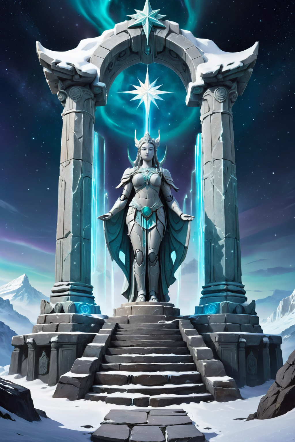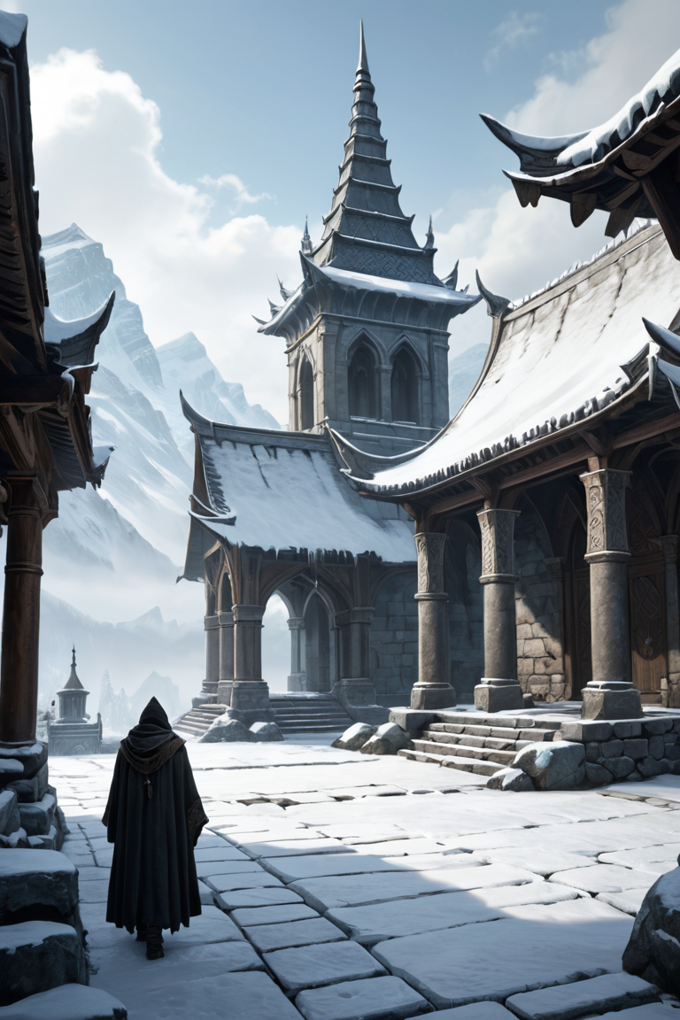 Ambient medieval western RPG soundtrack, subtle and supportive, Use only a few acoustic folk instruments: harp, lute, bass flute, or celesta, Simple melodic motifs in Dorian or Mixolydian mode, flowing gently, Slow, relaxed rhythms, Transparent, crystalline, and warm texture, evoking both the chill of a winter day and a welcoming sense of comfort, Atmosphere calm, serene, and reflective, evoking a quiet walk near the Temple of the Divines in Solitude on a cold winter day, Light snow drifts around the stone buildings, wind rustles the flags, and the warmth from the temple interior mixes gently with the crisp air outside, ‑piccolo, ‑high flute, ‑tin whistle, ‑soprano flute, ‑strings, ‑fiddle