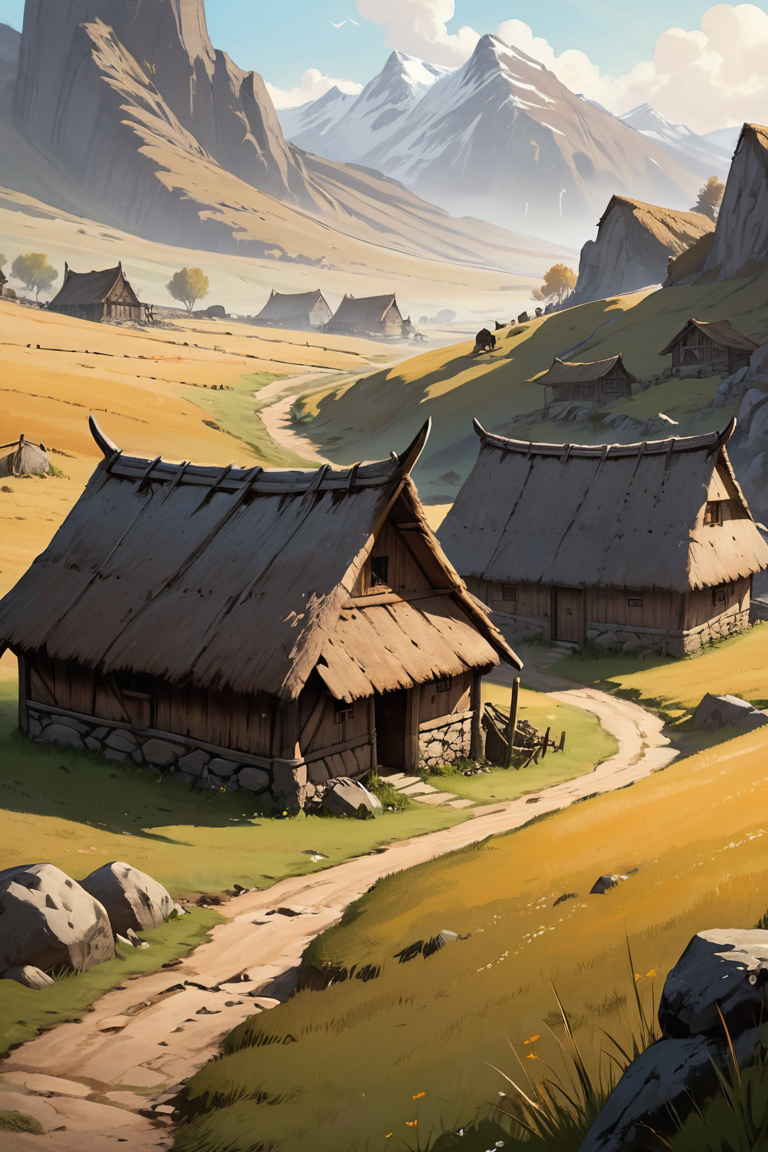 Ambient medieval western RPG soundtrack, subtle and atmospheric, Small lyrical variations, bright peaceful morning air, wandering bard heritage, gentle secondary motif, minimal uncluttered folk layers, drifting bass low whistle phrases, crisp alpine clarity, subtle background motion from nature, soft reverb, cold nordic night mood, traditional northern melodies, light syncopated lyre plucks, ancient acoustic storytelling, low frame-drum grounding, warm wooden bass flute tones, counter-melody on lyre, simple folk rhythmic backbone