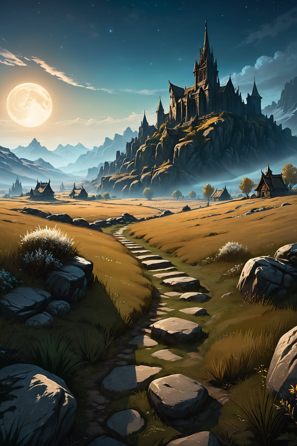 Ambient medieval western RPG soundtrack, subtle and atmospheric, low frame-drum grounding, expansive mountain quiet, subtle dual-hand harp tapping, early bardic traditions, minimal uncluttered folk layers, echoing cavern reflections, soft wandering bass flute line, soft instrument entry after a phrase, distant ritual drum hits, delicate psaltery plucks, wandering bard heritage, soft northern wind undertone, shimmering wind-harp background, traditional northern melodies, slow wandering traveler mood, cold nordic night mood, gentle medieval glow