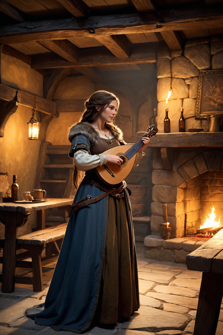 Ambient medieval western RPG soundtrack, subtle and supportive, Use only a few instruments: lute, optionally accompanied by very soft hand percussion, Clear, singable melodic motifs in Dorian or Mixolydian mode, flowing naturally, Moderate, relaxed rhythms with gentle rhythmic pulse, Warm, rustic, and intimate texture, like a bard playing a soft but melodic tune in a lively tavern, Atmosphere calm, reflective, and slightly melancholic, yet warm and welcoming, Evoking a quiet evening in a Skyrim tavern such as in Windhelm, The bard’s gentle song carries a clear melody across the room, mingling with soft murmurs and laughter from villagers, The hearth’s glow contrasts pleasantly with the cold night outside, creating a cozy, immersive setting, ‑piccolo, ‑high flute, ‑tin whistle, ‑soprano flute, ‑strings, ‑fiddle