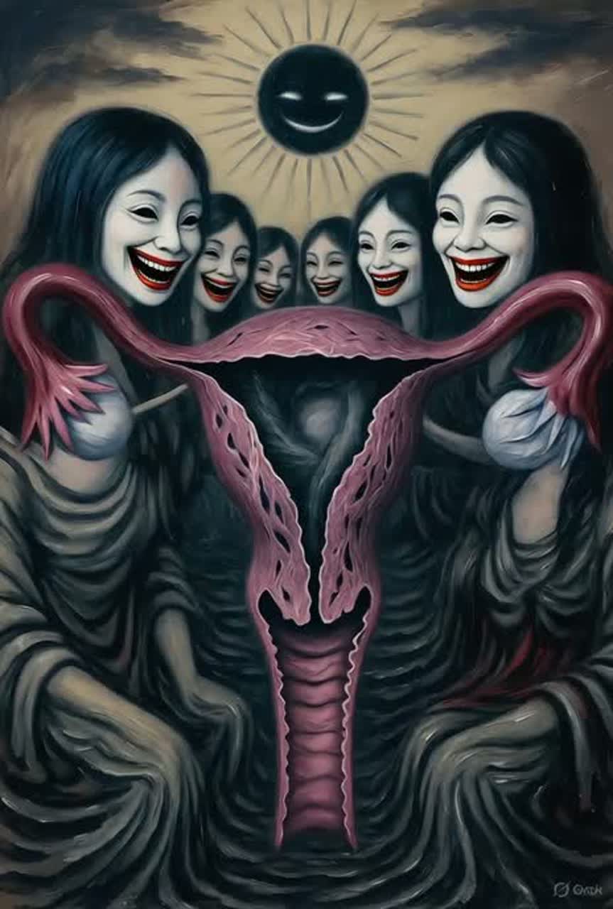 Create a mind-shattering fusion of symphonic death metal, progressive technical death metal, Japanese kayōkyoku, church hymns, and grindcore, Vocals are delivered like a raving madman: guttural growls, savage gatorals, mixed voice screams, piercing whistle register, sky-high falsettos, and massive layered choirs, all pushed aggressively to the front of the mix, Guitar solos are hyper-progressive, virtuosic, and melodic, played on down-tuned guitars drenched in thick distortion; pan guitars hard left and right for a massive stereo spread, Bass is slapped with extreme distortion and aggression, Drums feature relentless blast beats and hyper-tense double-kick patterns, Tempo shifts violently between blistering speeds and crawling slowness, with frequent key changes and modulations, Overall vibe: chaotic, violent, blasphemous, and unhinged, [symphonic death metal] [progressive technical death metal] [grindcore] [kayōkyoku] [hymn] [extreme vocals] [blast beats] [down-tuned guitars] [slap ba