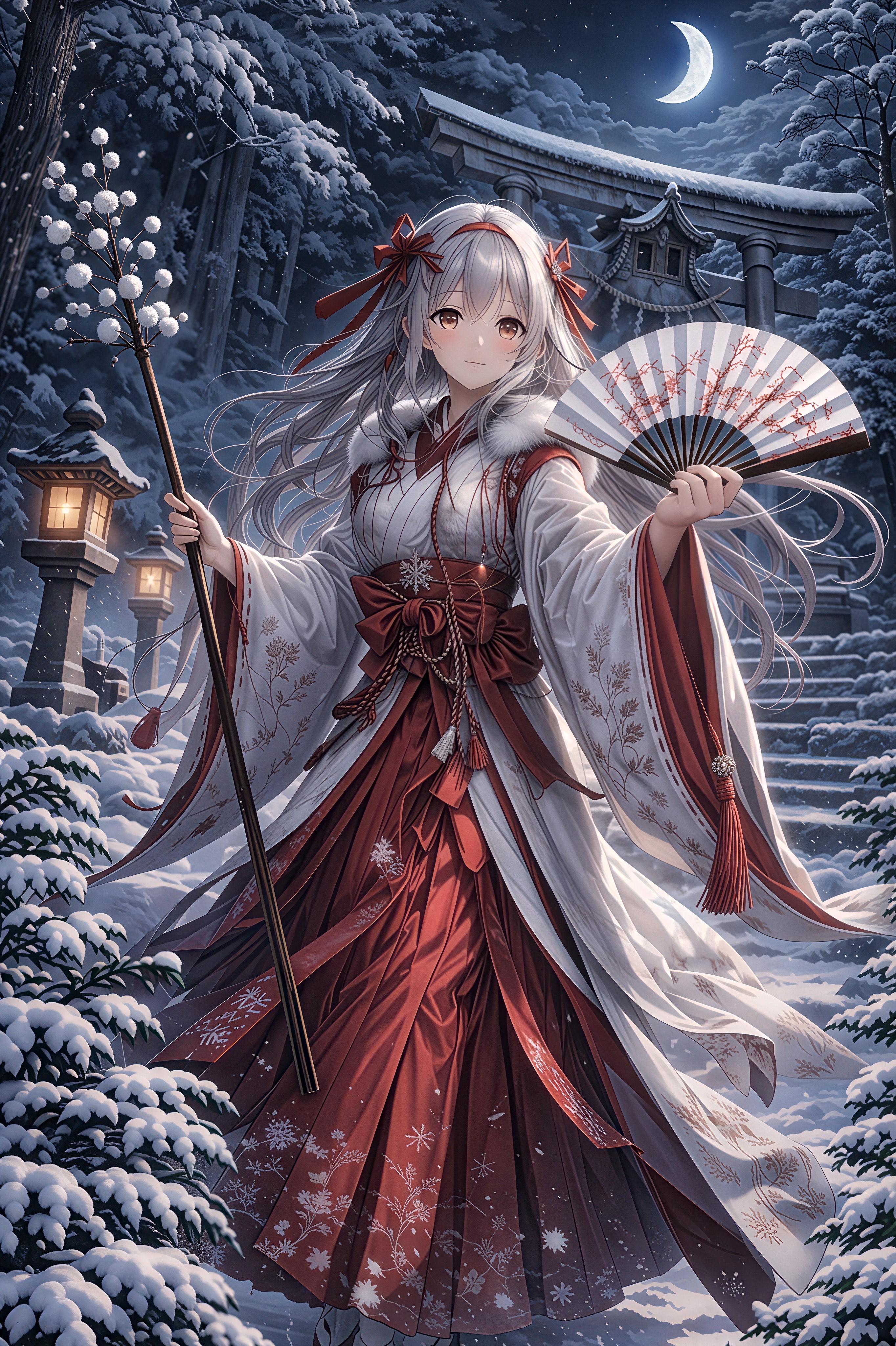Style: Sacred Wagakki Ritual, Slow Ceremonial Taiko Rhythm Like A Kagura Dance, Shakuhachi And Fue Carry Cold Wind Melodies, Koto Resonates With Clear Frost-Like Notes, Female Vocal In Japanese Ritual Singing Style With Calm Authority, Voice Feels Ancient And Sacred Rather Than Emotional, Music Represents The Appearance Of The Frost Shrine Maiden Performing A Winter Kagura Under The Full Moon, The Atmosphere Is Cold, Still And Majestic, Snow And Frost Motifs In The Instrumentation, Shamisen Used Sparingly With Clean Resonant Notes, No Orchestral Framing, No Electronic Synths, Pure Sacred Wagakki Ritual, The Song Feels Like A Divine Presence Awakening