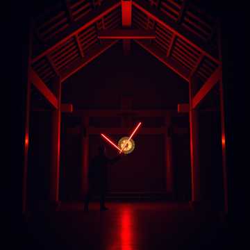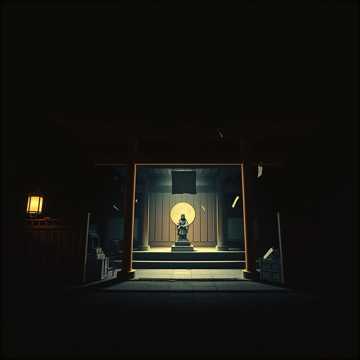 Style: Dark Wagakki Ritual Atmosphere, Slow, Tense And Eerie, Sparse Taiko Strikes With Long Echoing Spaces, Shakuhachi And Fue Carry Haunting Melodies, Solo male Vocal In Japanese Folk / Ritual Style, Quiet, Introspective Delivery With Firm Tone And Clear Consonants, No Choir Or Vocal Layering, Music Feels Like Entering An Abandoned Shrine At Night, Wind Through Broken Wood, Watchful Silence, A Place That Does Not Welcome Visitors, Shamisen Used Sparingly With Isolated String Plucks, Koto Produces Sparse Resonant Notes, No Orchestral Framing, No Cinematic Swells, No Electronic Synths, Pure Traditional Wagakki Atmosphere, Tension Slowly Builds As The Character Gathers Resolve In The Darkness