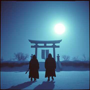 Style: Wagakki Narrative Duet, Begins Soft And Introspective With Sparse Koto And Shakuhachi, Slow Taiko Heartbeat Rhythm, Music Feels Quiet And Intimate Inside An Old Shrine After Battle, Male And Female Vocal Duet In Japanese Folk Style, Gentle Call-And-Response Dialogue Between Voices, Midway Through The Song The Music Gradually Builds As The Full Moon Rises, Taiko Rhythm Grows Stronger And Shamisen Introduces Determined Forward Motion, The Characters Realize Something Supernatural Has Been Stirred By The Moon, The Music Shifts From Quiet Reflection To Journey Energy, Shamisen Leads The Second Half With Determined Rhythmic Drive, No Orchestral Framing, No Electronic Synths, Pure Wagakki Instrumentation, Ends With A Sense Of Alliance And Departure Toward Another Shrine Known As The Frost Shrine