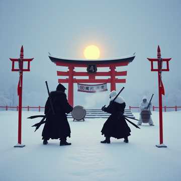 Style: Reflective Wagakki Epilogue, Slow And Gentle Composition With Soft Koto Arpeggios And Calm Shakuhachi Melodies, Taiko Used Sparingly Like A Distant Heartbeat, Male And Female Vocal Duet In Japanese Folk Style With Quiet, Emotional Delivery, The Music Represents Dawn Over A Battlefield Frozen In Ice, A Mysterious Samurai Turns Away And Walks Into The Snow, His Footsteps Fading As His Body Dissolves Into Light, The Tone Is Peaceful But Unresolved, Suggesting The Conflict Has Only Been Paused, No Orchestral Framing, No Electronic Synths, Pure Traditional Wagakki Atmosphere, The Song Ends With A Sense Of Quiet Departure And Future Reunion