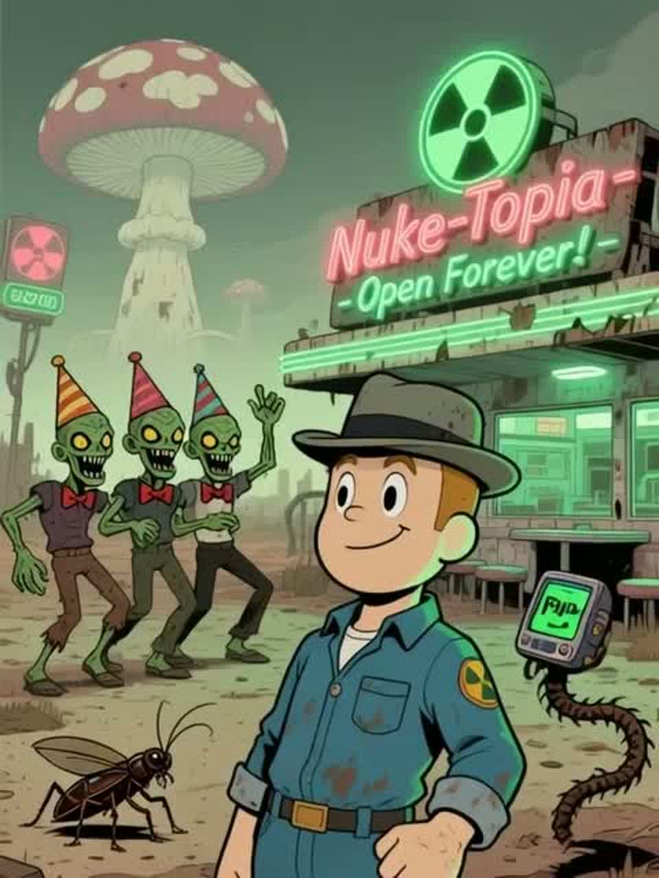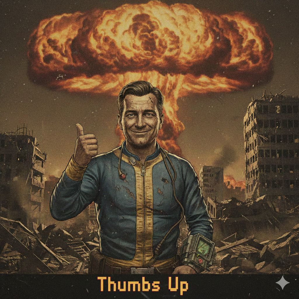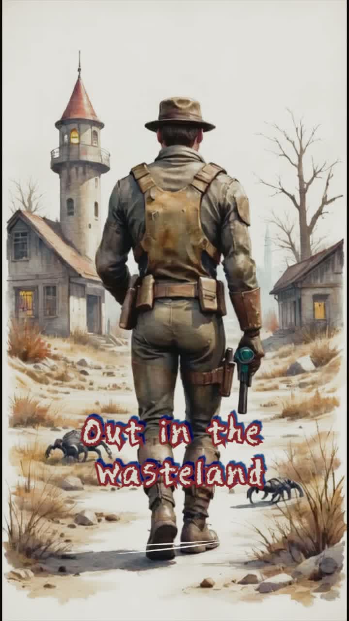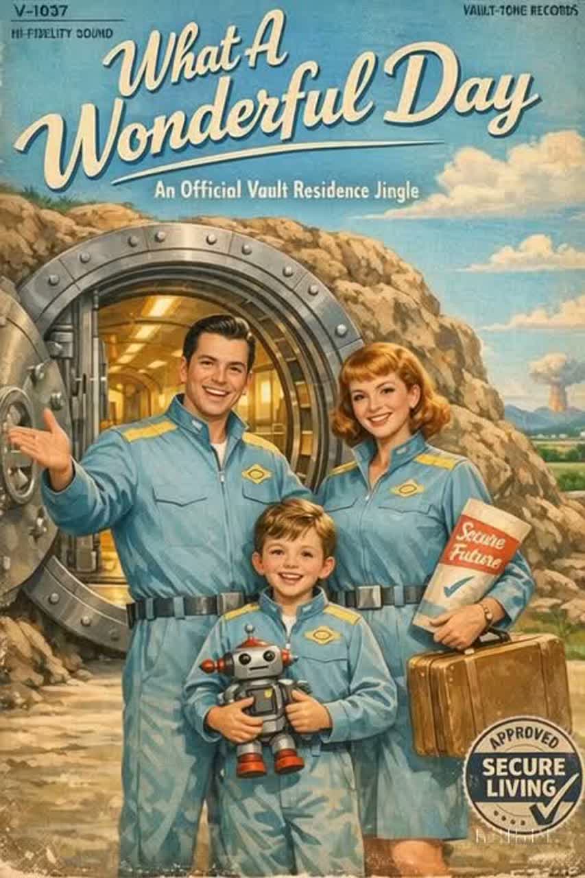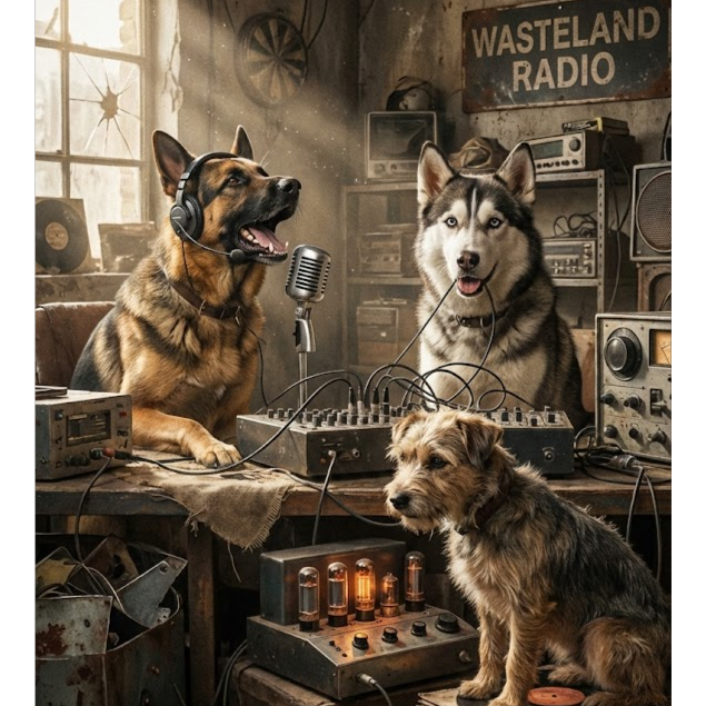 Style: Post-apocalyptic radio drama, Fallout Shelter–inspired, Spoken-word dominant, male host, playful, quirky, cheerful, broadcasts like a lighthearted wasteland radio DJ, English, Audio: old AM/FM broadcast, vintage 50s–60s analog tone, heavy static, [RADIO STATIC FX: crackle, slightly overtuned], signal loss, noise bursts, gunshot FX, Music: dynamic tempo, playful dark ambient underscore, vintage synths, brass melodic & bright, sparse percussion, old-world jingle fragments, Structure: serialized news, hooks, cliffhangers, instrumental breaks for “music nonstop”, static hides sensitive info (vault number), Mood: ironic, absurd, quirky, light-hearted post-apocalyptic humor, imperfections welcome, ‑RAP