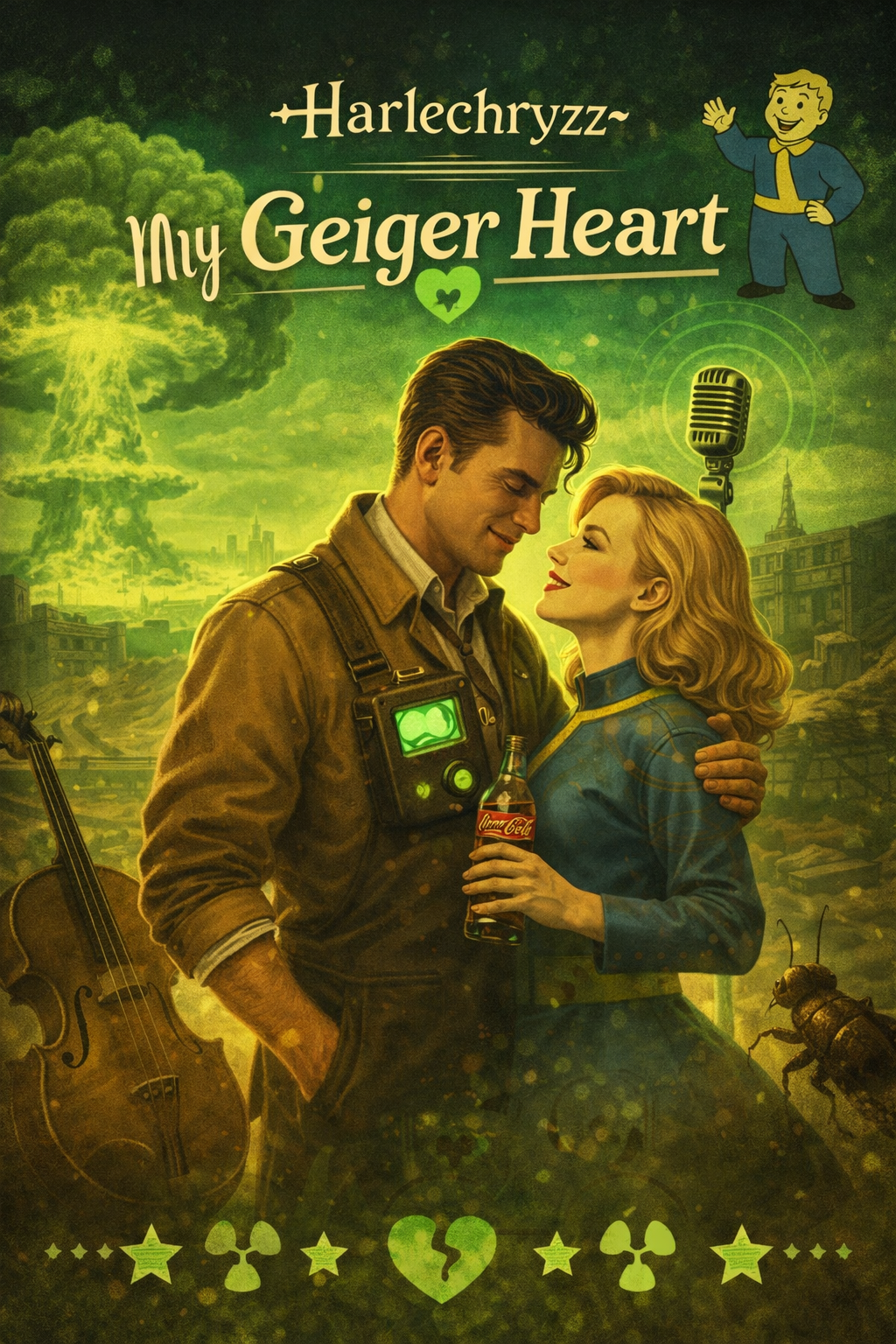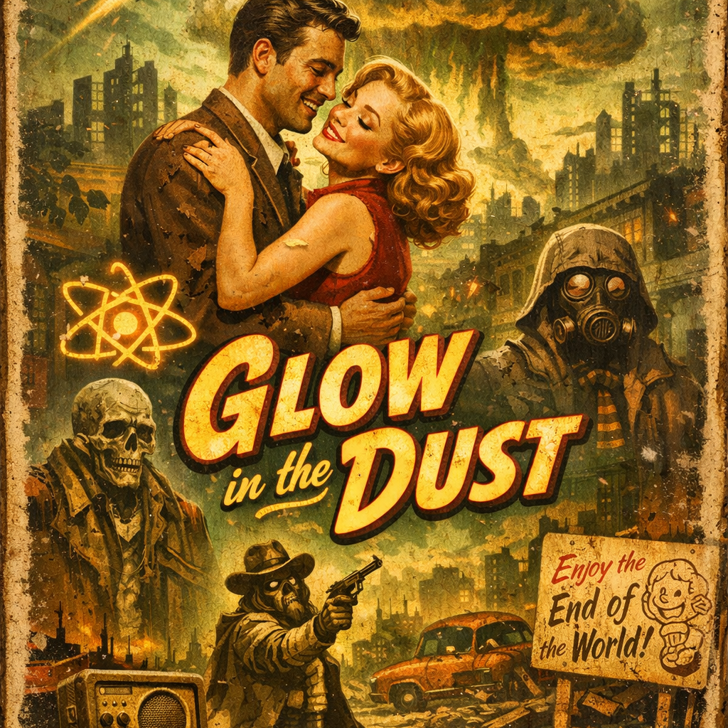 Post-apocalyptic swing/jazz in the style of 1950s radio broadcasts, Warm vinyl textures with crackle and hiss, upright bass, brushed drums, soft piano, playful brass accents, Sung verses, spoken DJ interludes, light tape flutter, subtle reverb, echo, and radio static create a nostalgic, slightly eerie, charmingly quirky atmosphere, Catchy swing melodies and smooth vocals evoke romance and humor in a glowing wasteland setting, ‑Excludes Prompt (english, ‑comma-separated): electronic dance, ‑hardstyle, ‑EDM, ‑trap, ‑modern pop, ‑heavy metal