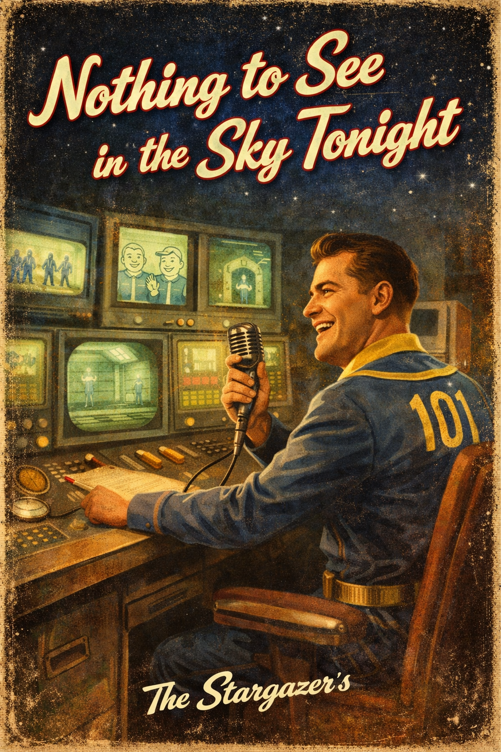 1940s–1950s swing novelty song, upbeat tempo, big band brass, smiling male announcer-style vocals, Clean but slightly muffled broadcast sound, vinyl crackle, institutional cheer, Overly reassuring tone with dark irony, Lyrics deny sightings in the sky, encourage calm, safety, compliance, Feels like an official Vault-Tec radio broadcast after the bombs