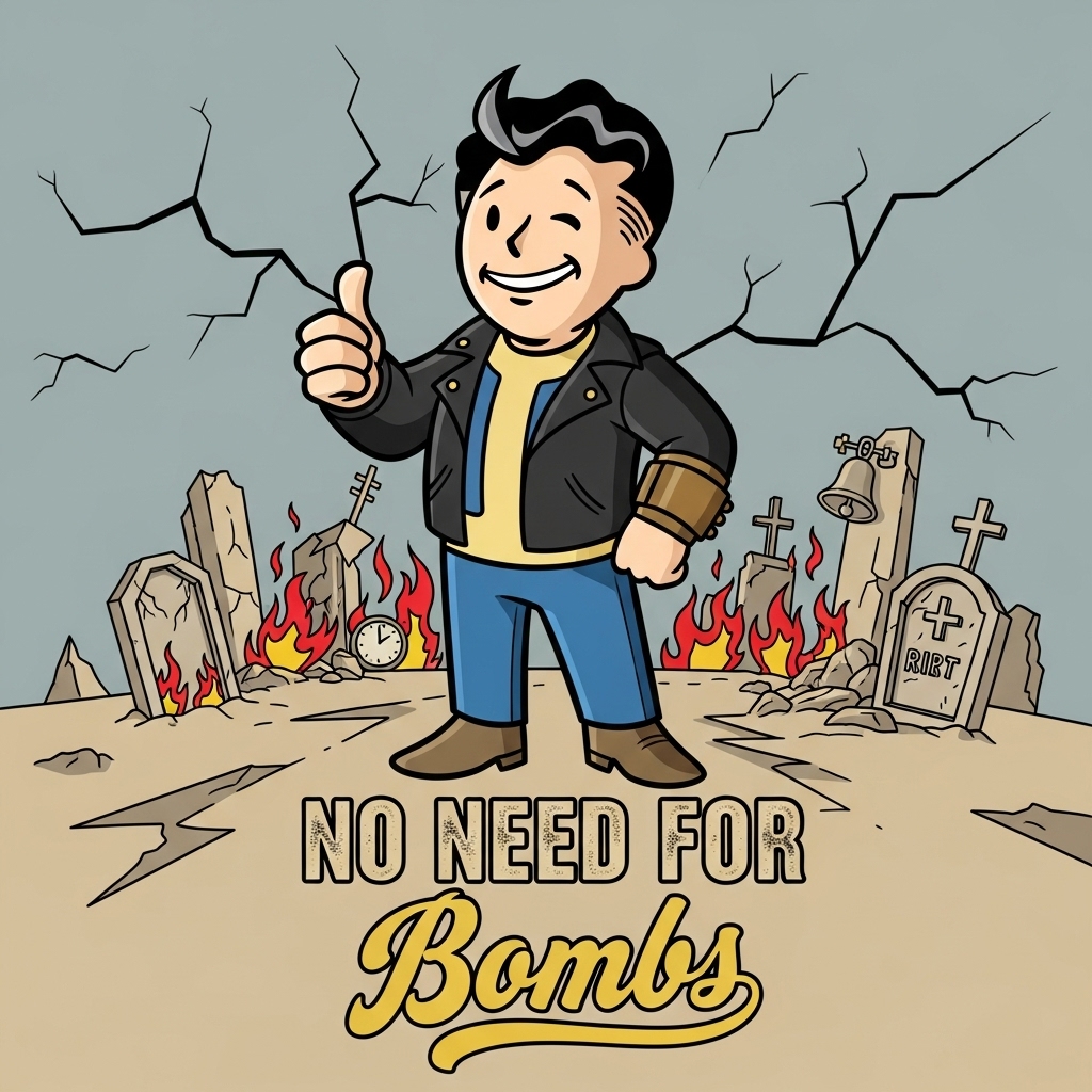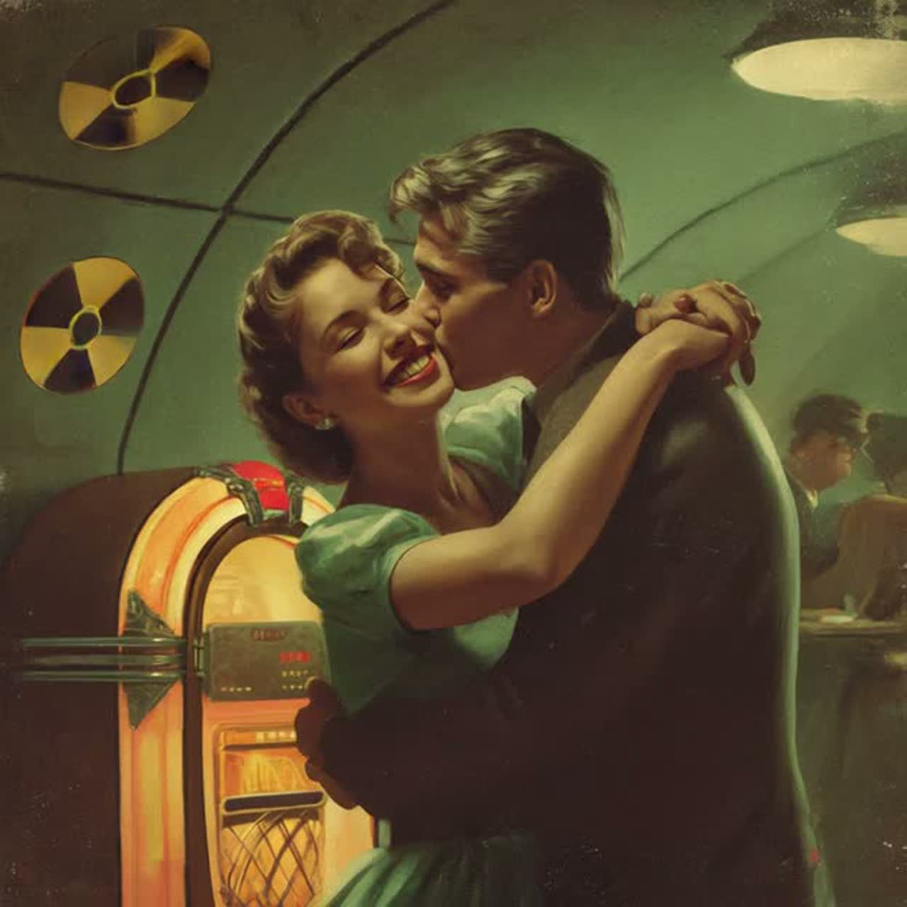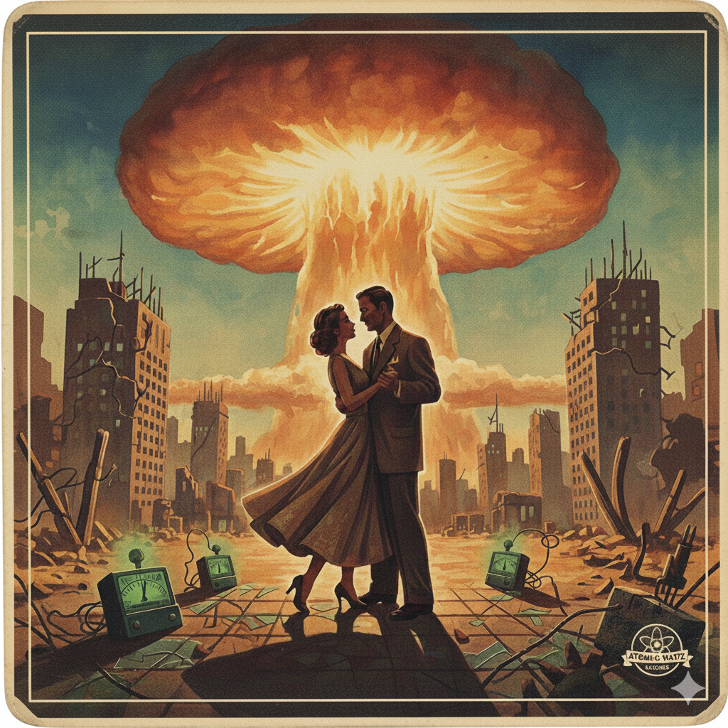 old gramophone recording, slightly distorted, slow, A cheerful yet dark 1950s retro-futuristic song, Upbeat swing/jazz with barbershop harmonies, walking bass, brass stabs, and vinyl crackle, Male crooner vocals, warm and confident, smiling propaganda tone, Lyrics glorify the atom bomb as humanity’s “solution, ” celebrating waiting safely in a bunker while the surface world is destroyed, Dark humor, ironic optimism, corporate jingle vibes, Catchy chorus, whistling-friendly melody, радио-announcer outro with static, Mood: happy apocalypse, vault propaganda, nuclear optimism