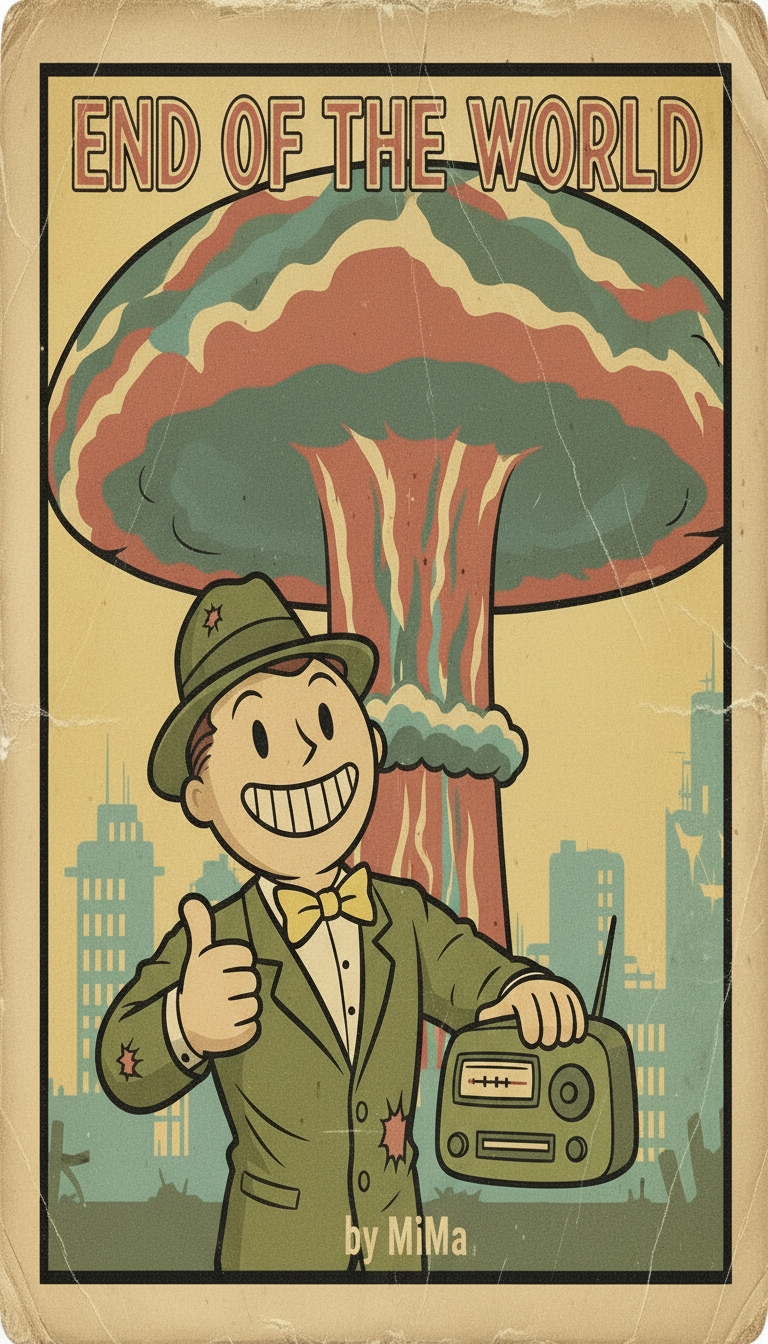 A warm vintage crooner ballad inspired by 1940s radio music, slow swing tempo, smooth male vocal with a gentle vibrato, intimate and nostalgic delivery, analog feel with soft vinyl crackle, muted trumpet and brushed drums, upright bass, subtle piano chords, romantic yet ironic post-apocalyptic atmosphere, bittersweet optimism, cozy lounge mood despite a ruined world, timeless melody, emotional but restrained, nostalgic end-of-the-world love song, classic old-radio production style, soft reverb, warm mono-to-stereo soundstage, cinematic and heartfelt