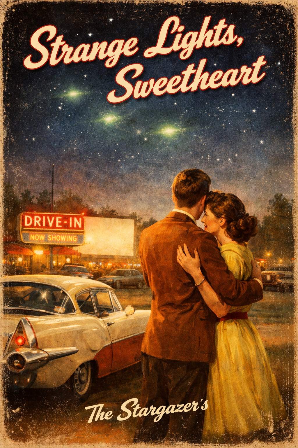 1950s doo-wop / crooner ballad, warm vintage microphone, male lead vocal, close harmony backing vocals, Vinyl crackle, soft tape hiss, gentle swing rhythm, Cheerful romantic tone with subtle unease underneath, Lyrics about strange lights over highways, rumors, radio reassurance, pre-war America, Sounds like a radio hit recorded shortly before a nuclear apocalypse