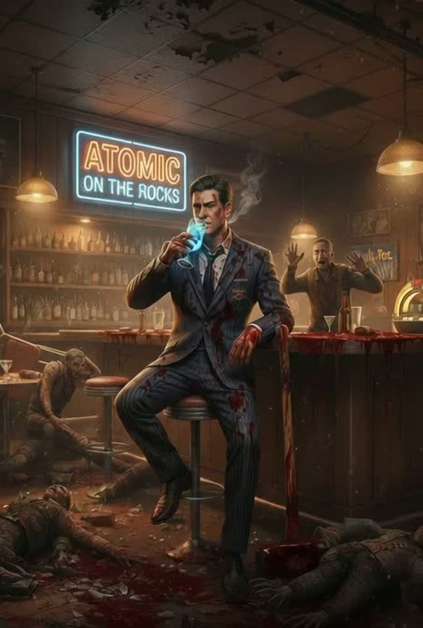 Post-apocalyptic retro swing/jazz inspired by 1950s radio broadcasts, featuring smooth male crooner vocals and charismatic DJ spoken segments, Includes classic 50s-style jingles with catchy, upbeat melodies and bright brass accents, Warm vinyl crackle, tape saturation, analog radio static, nostalgic cozy atmosphere with dark humor, Fallout references like radiation, bottle caps, and mutants are woven in, Spoken DJ interludes timed naturally between segments, improvisational quips, and retro-radio authenticity, ‑heavy metal, ‑modern EDM, ‑rap vocals, ‑explicit profanity, ‑overly futuristic sounds, ‑humming, ‑yodeling