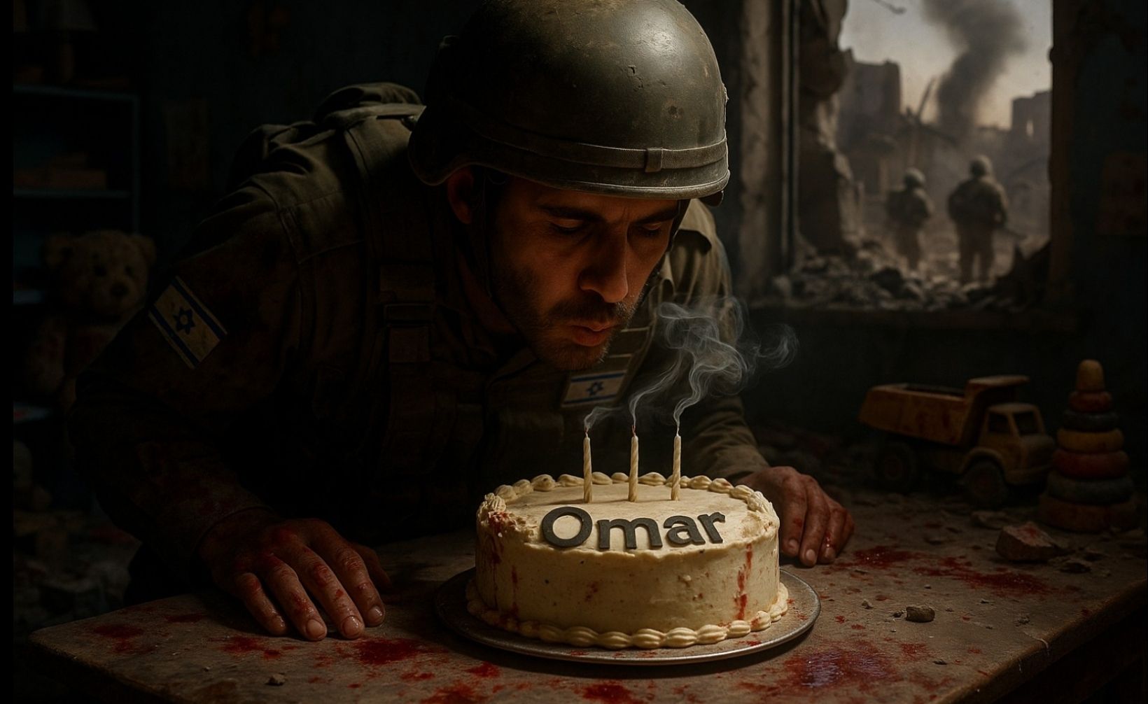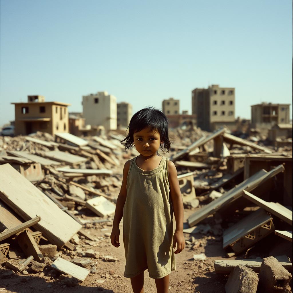 Soft, fragile child voice (around six years old), untrained and breathy, Sings quietly, sometimes whispering, trembling, slightly off-key and uneven, Short phrases, audible breaths, natural pauses, imperfect timing, Emotion: fearful, innocent, lonely, raw, Feels like a small street singer in ruins, people passing in the distance, Only one violin plays softly in the background, distant and thin, No other instruments, Sparse, minimal, open atmosphere, Key: E minor
