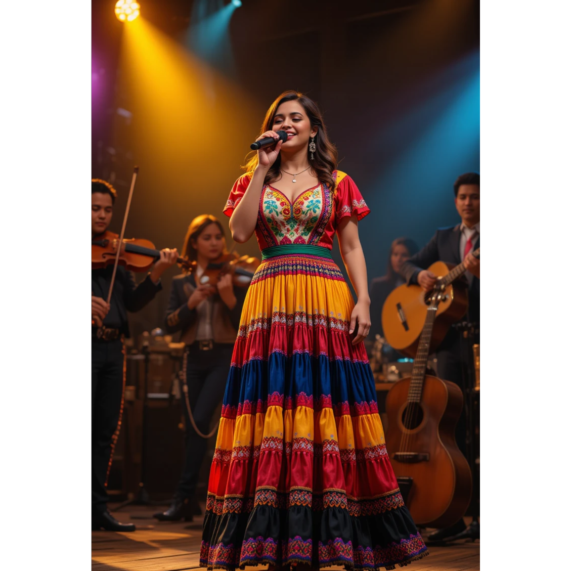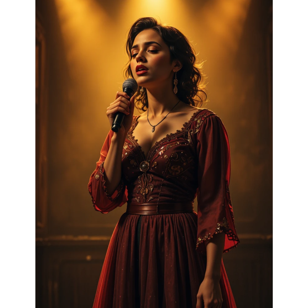 Begin with a warm, resonant female ranchera voice over gentle guitar and soft strings, her delivery intimate and breathy, Verses feature subtle phrasing and tender dynamics, The chorus swells with full mariachi: trumpets, violins, and guitarrón rising as her voice soars with sustained, emotive vibrato, Dynamics arc organically; pauses and breaths enhance authenticity, Each section allows her expressive voice to project both strength and longing, cutting through the ensemble while retaining warmth, grace, and deep-rooted tradition
