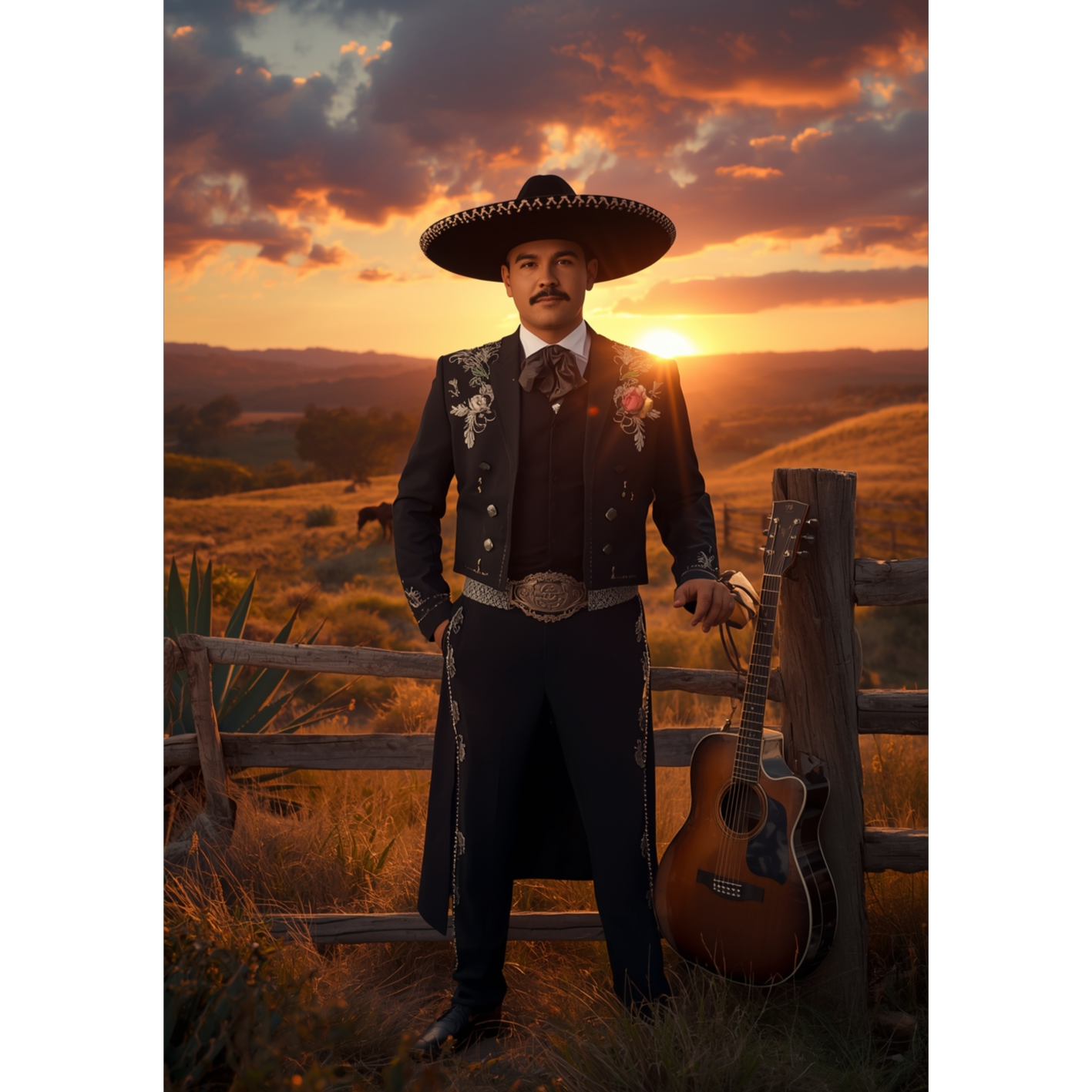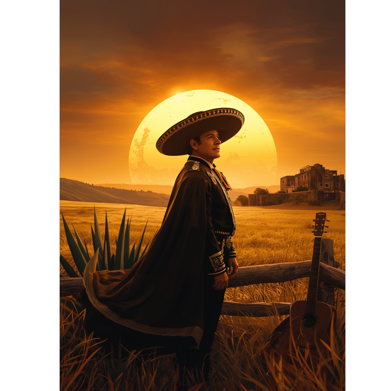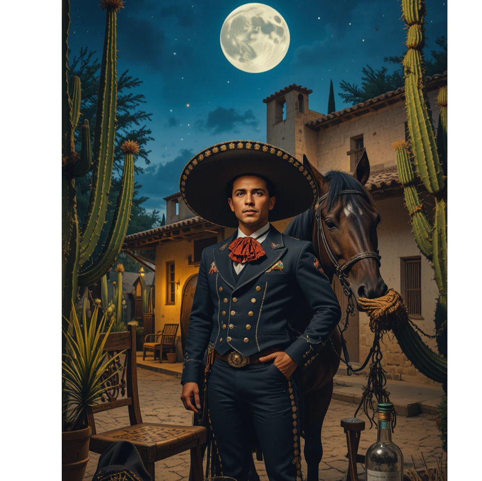 A ranchera mexicana with stately acoustic guitar, rhythmic guitarrón, percussive vihuela, expressive violins, and bold trumpets, arranged for a traditional mariachi, The deep-voiced male lead delivers heartfelt, commanding lines atop passionate, nostalgic melodies, with dramatic dynamic builds, emphatic choruses, and rich instrumental breaks, Instrumental interludes and harmonized mariachi vocals enhance the dignified, melancholic mood, Studio production brings cinematic depth, suited for a cantina or open-air evening