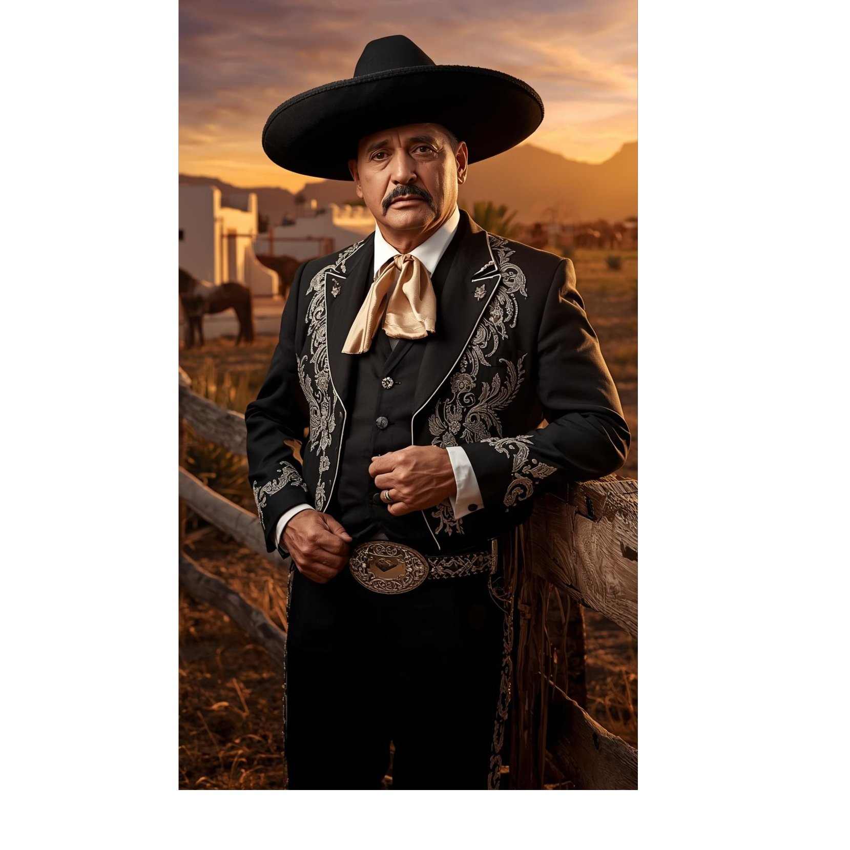 A slow Mexican ranchera ballad in 3/4, featuring a classic mariachi ensemble: guitarrón and vihuela driving a gentle pulse, acoustic guitars laying warm chords, trumpets replying with plaintive phrases, violins weaving tender countermelodies, The deep, resonant vocal sits prominently in an intimate, reverberant mix, exuding pride and heartbreak, Dramatic, nostalgic, and majestic, the arrangement is lush yet spacious, evoking rural dusk