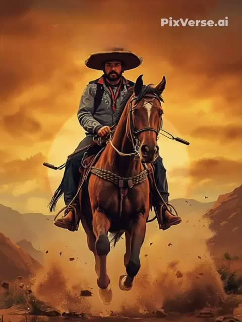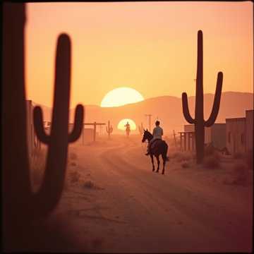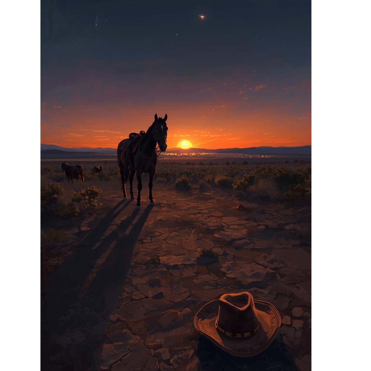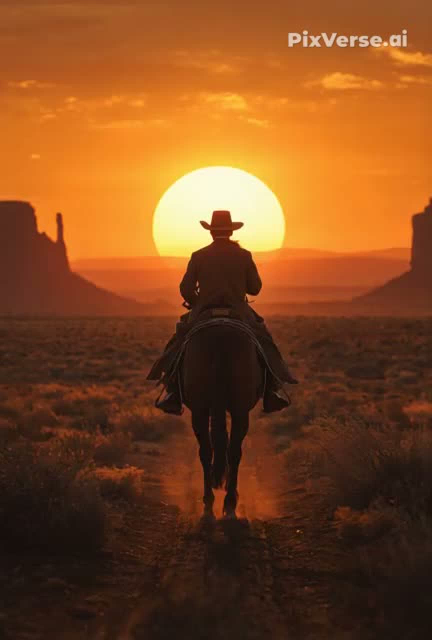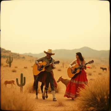Epic western cinematic track with a nostalgic and heroic atmosphere, Slow to medium tempo with dramatic tension and wide desert sound, Begins with a lonely whistled melody and reverb electric guitar, evoking vast open landscapes and a lone rider crossing the frontier, Gradually builds with acoustic and electric guitars, low brass, and a distant trumpet theme, Subtle percussion using dry snares, hand claps, and metallic hits create the feeling of a tense duel at sunset, Deep bass and echoing tremolo guitars add grit and mystery, Choir “ah” and “oh” voices rise in the background like desert ghosts, The mood blends melancholy, courage, and fate — a journey through dust, silence, and destiny, Ideal for western storytelling, frontier justice, and cinematic showdowns, Ends with a fading whistle and galloping rhythm, leaving the echo of the desert behind