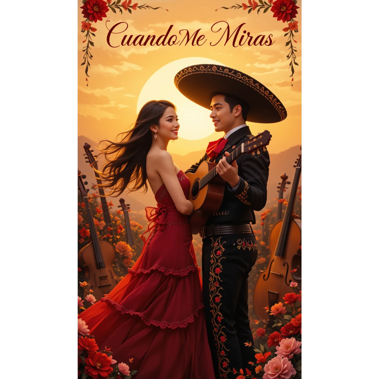 A slow-tempo ranchera builds on intensely strummed acoustic guitars, anchoring a nostalgic atmosphere, Warm, expressive violins and bold, intertwining brass create lush textures, The male vocal is deep and impassioned, soaring over dramatic mariachi arrangements in every chorus and bridge