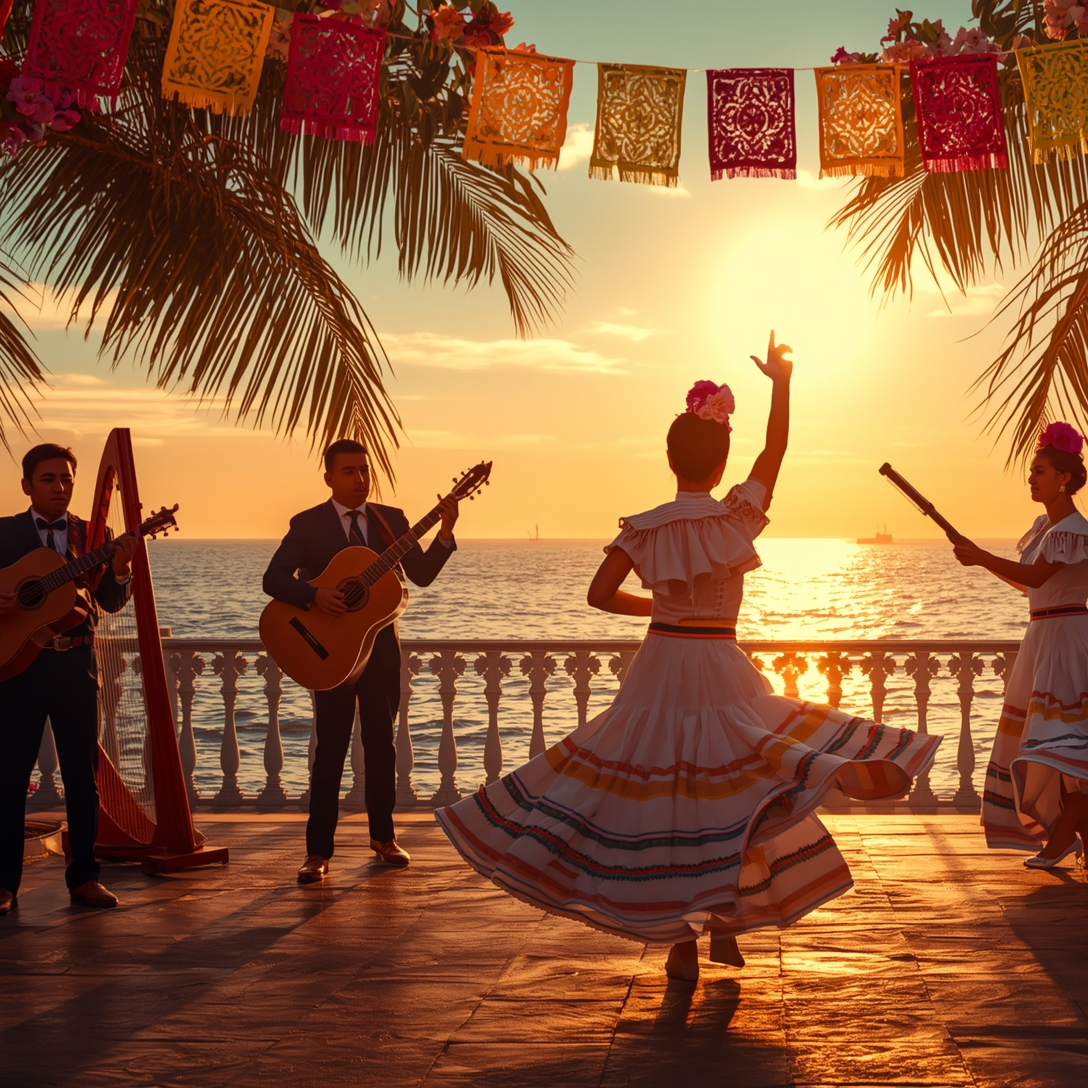 The upbeat son jarocho opens with vibrant jarana and requinto, joined by melodic harp runs, Warm bass guitar and soft cajón, bongos, and light kick drive a propulsive groove, Bright male vocals take lead, lively female harmonies answer in festive call-and-response, Hand claps and natural room reverb infuse ensemble energy, while crisp highs and rich lows in the modern mix keep it dynamic and danceable
