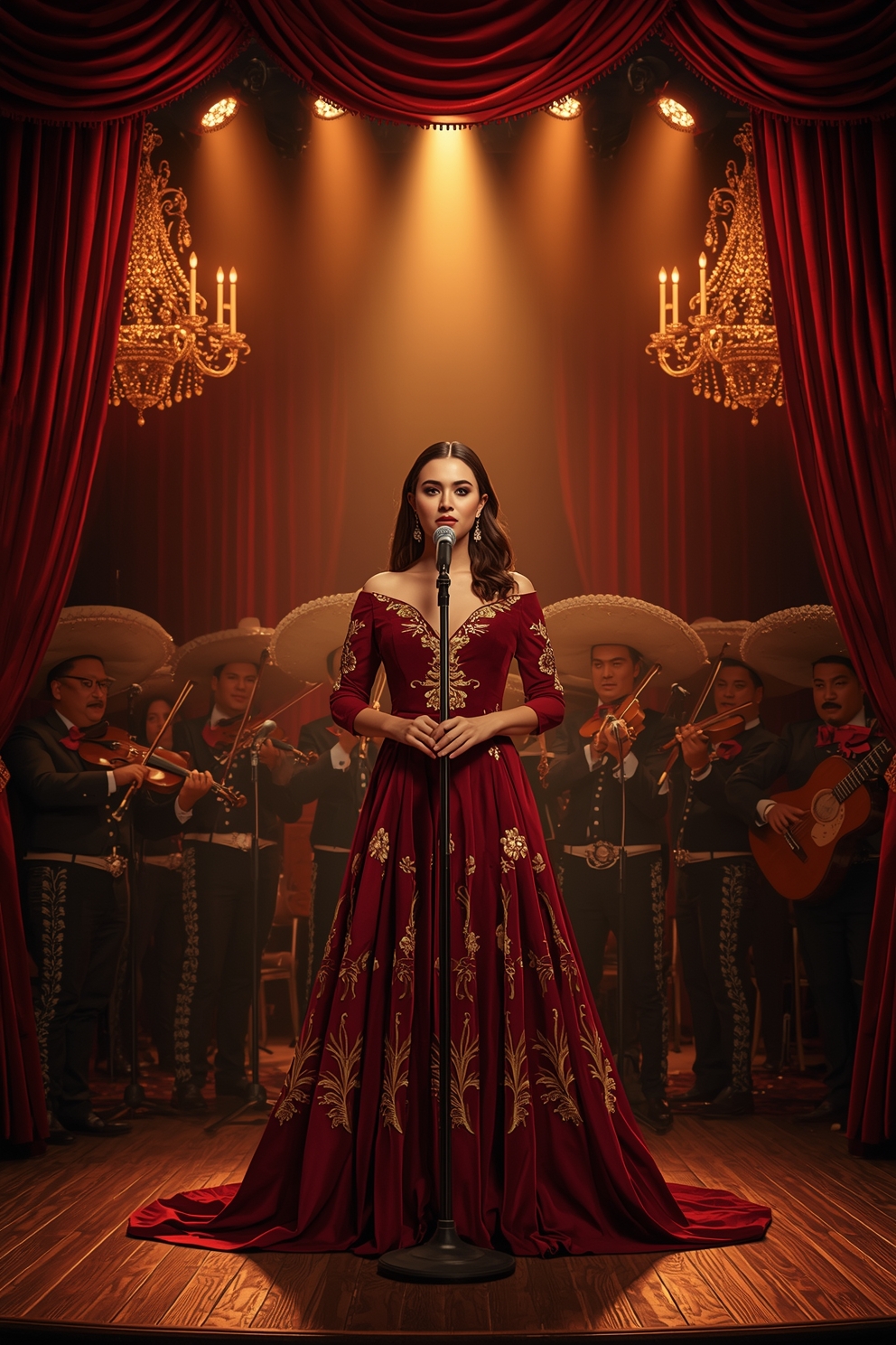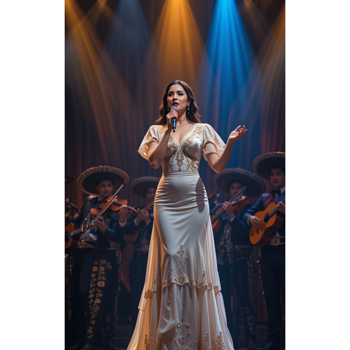 Romantic ranchera-pop ballad with a warm, crystalline female vocal, Expressive tone with emotional vibrato, classic phrasing, and dramatic yet elegant delivery, Influences of mariachi and bolero-ranchera: heartfelt melodies, soaring high notes, and sentimental storytelling, Arrangement includes acoustic and requinto guitars, mariachi trumpets, sweeping strings, soft vihuela textures, and deep, resonant bass, Rhythmic touches of ranchera bolero with subtle percussion, Production is warm, cinematic, nostalgic, blending vintage Mexican romanticism with refined Spanish vocal clarity, Mood: passionate, sentimental, noble, dramatic, evoking timeless ranchera-pop elegance