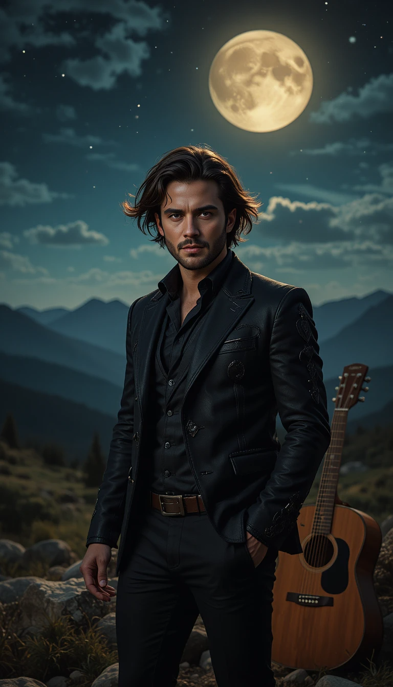 Epic orchestral Spanish soundtrack with cinematic energy and heroic flair, Blend flamenco guitars with bold trumpets, strings, and martial drums echoing through the night, The rhythm should feel galloping, symbolizing the rider’s movement through darkness, Add deep reverb for mystery and grandeur, Vocals should be male, expressive, strong, and slightly rough—singing in Spanish with a sense of honor, courage, and melancholy, Include dramatic choir harmonies on choruses for a mythic touch, Mix acoustic guitars, timpani, and subtle castanets for texture, Keep the tone noble, adventurous, and cinematic—like an old legend retold under moonlight, Use wide stereo space, organic reverb, and dynamic rises between verses and refrains