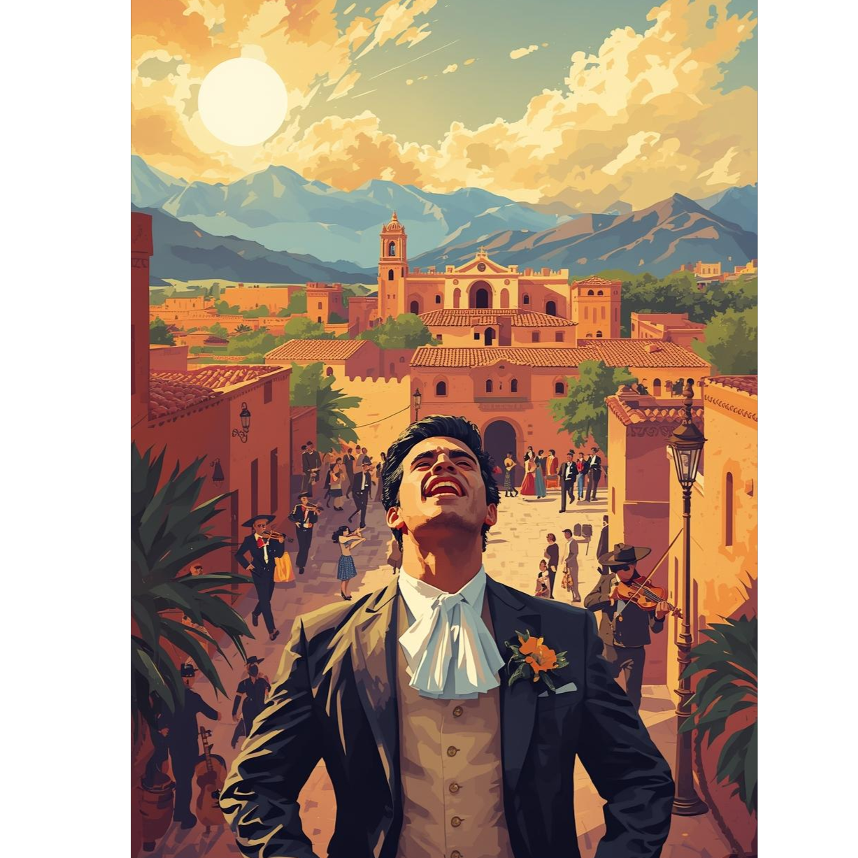 Mexican-themed chanson with a grand, orchestral arrangement, The style is theatrical and bombastic, characteristic of operetta and popular French chanson of the mid-20th century, Key instruments include a full orchestra featuring prominent strings (violins, cellos), brass (trumpets, trombones), and woodwinds (flutes), A rhythmic section with a strong, march-like beat is provided by percussion, possibly including snare drums and cymbals, evoking a festive, almost military feel, The song features a male tenor soloist, whose voice is powerful, clear, and dramatic, with a distinctly operatic quality, He sings with passion and a sense of grandeur, using vibrato to emphasize key phrases, The chorus is sweeping and uplifting, often with a choir adding to the magnificent atmosphere, The overall mood is one of celebration, romance, and national pride, executed with a sophisticated, classical flair