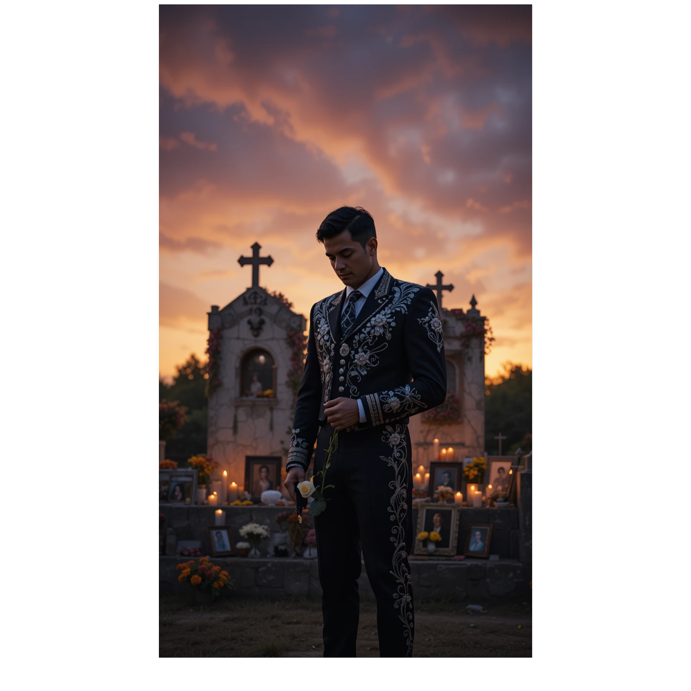A Mexican ranchera ballad at a slow tempo, propelled by strummed guitars, rhythmic vihuela, and deep guitarrón, Expressive violins weave heartfelt lines, while soft trumpets add subtle emotion, The male tenor voice, warm and mature, carries gentle vibrato and dramatic pauses, emphasizing key phrases, After the final stanza, the instrumentation gradually withdraws, closing with a nostalgic, devotional instrumental solo that fades like a prayer