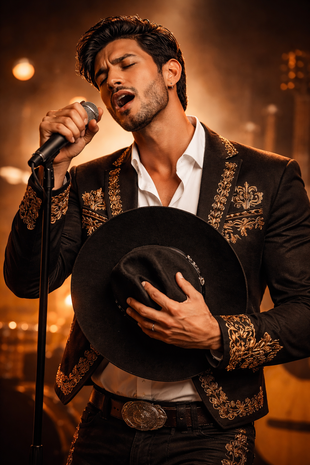 Modern ranchera with traditional mariachi instrumentation, powerful and passionate male vocals, contemporary arrangements featuring guitars, trumpets, and percussion, blending Mexican tradition with modern production, emotive and heartfelt atmosphere, emotional build-up with a strong vocal climax in the chorus, evoking the romance and pride of the genre, without citing or referencing specific artists