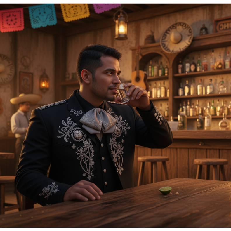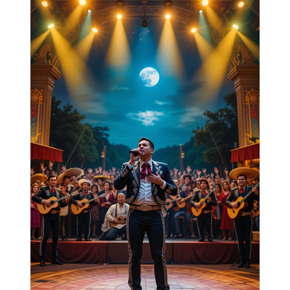 Bold trumpets and agile violins trade spirited call-and-response melodies over syncopated acoustic guitars and steadfast tambora, building festive momentum, Opulent male vocals rise above the dramatic mariachi arrangement, with bright whistling interludes bridging verses, adding celebration and flair