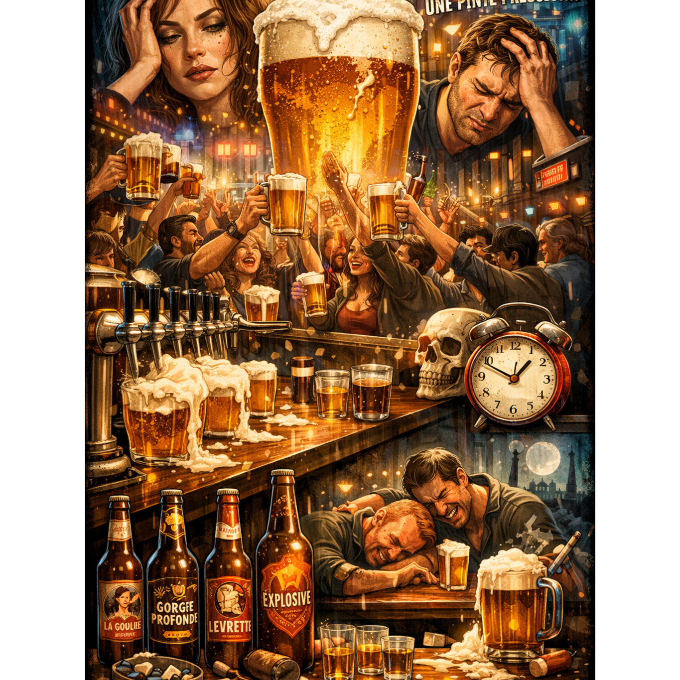 Chanson rock-folk festive (≈104 BPM), Ambiance conviviale de bistrot du vendredi soir : guitares acoustiques claquantes, basse ronde, batterie pop-folk entraînante, touches d’accordéon et percussions légères (claps, tambourin), Quelques sons de verres et rires en fond pour la chaleur du moment, Voix principale naturelle, légèrement éraillée, ton complice et expressif, entre chant parlé et phrases chantées avec énergie, Chœurs de potes en refrain pour le côté “on chante tous ensemble”, Mixage chaleureux, reverb de salle, énergie live, Esprit : humour tendre et lucide, célébration de la vie simple, de l’amitié et des excès assumés, Un morceau solaire et populaire, fait pour lever son verre, rire et philosopher entre deux gorgées, ‑voix feminine
