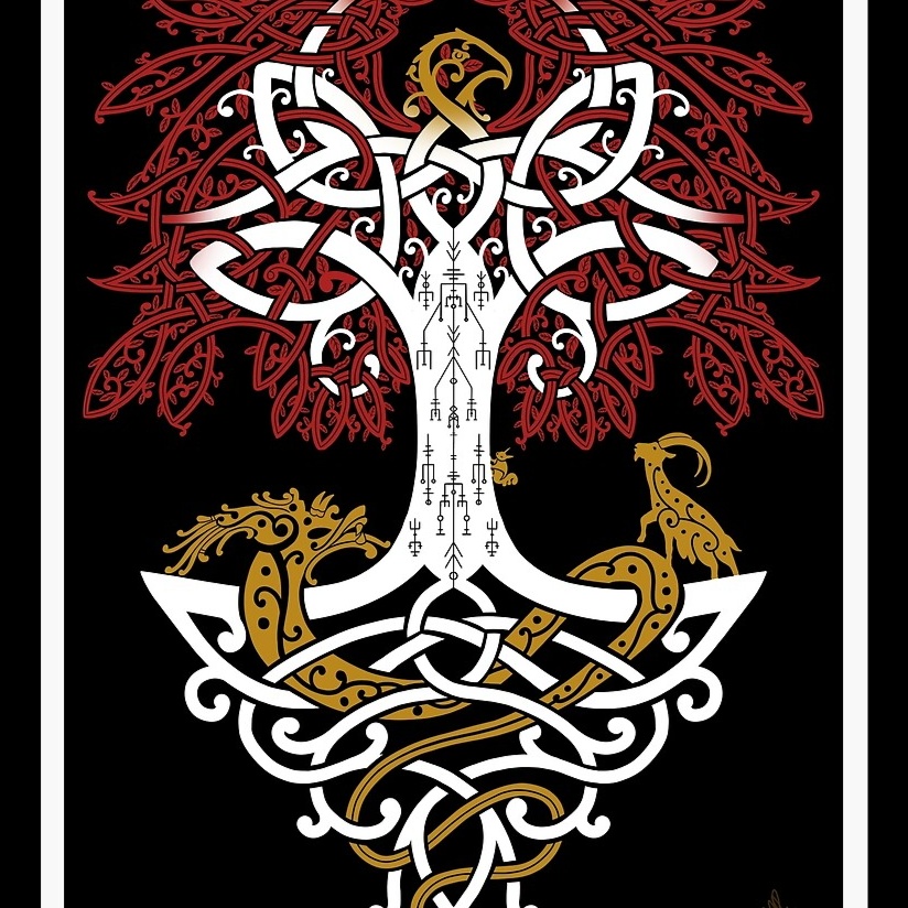 Nordic pagan ritual song channeling the voice of the world tree, Echoes of ancient bloodlines and gods awaken through pounding wardrums (tungur), droning tagelharpa, haunting bone flutes, and deep horns (lur, bukkehorn), Chanted invocations to Odin, Frigg, and the tri-norns rise in layered choirs, with mournful female vocals spiraling into ancestral trance, Ethnic percussion drives the root-rhythm of Yggdrasil, while ambient frost wind and distant fire crackles surround the mix, Each breath feels like a sacred rite under moonlight, A mythic soundscape of Norse fate, earth power, and the living tree