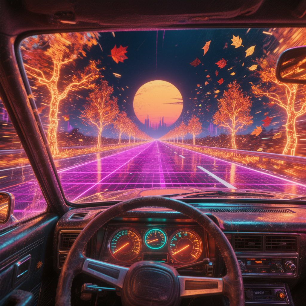 The track opens with the soft hiss of lofi cassette crackle and distant rain, droplets pattering against a metal roof as wind stirs fallen leaves outside, Warm analog pads bloom like the last light of an overcast afternoon, filling the space with a nostalgic glow, The air hums with memory: faint, modulated vocal fragments drift through static, while deep synth bass and retro drum machines pulse beneath, steady as a heartbeat, Lush melodies unfold like orange leaves caught in slow motion, shimmering through glassy arpeggios and airy leads, The rhythm sways between stillness and motion, echoing the quiet melancholy of late autumn days, Gated reverb snares ripple through the haze; granular textures and reversed tones swirl like wind against the windowpane, As the piece evolves, the night deepens, then softens, The rain fades into mist, and the warmth of the analog tones begins to dissolve into an open, cinematic horizon, Vaporous harmonies rise like dawn light breaking over amber trees