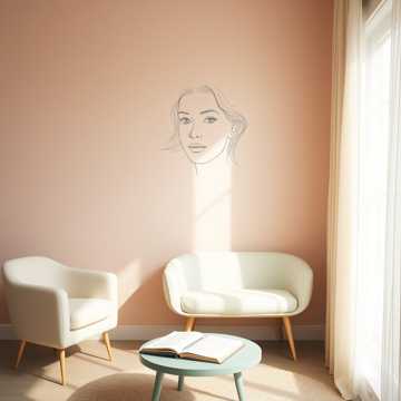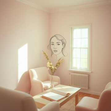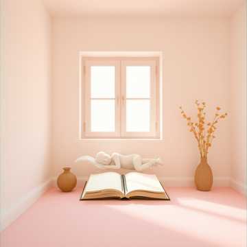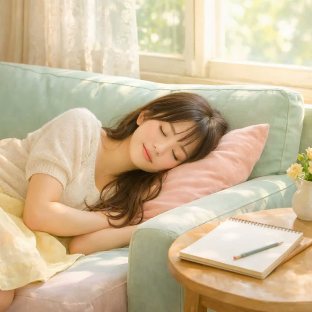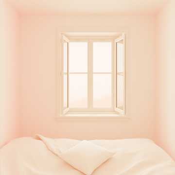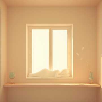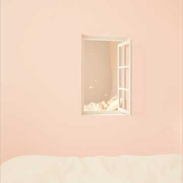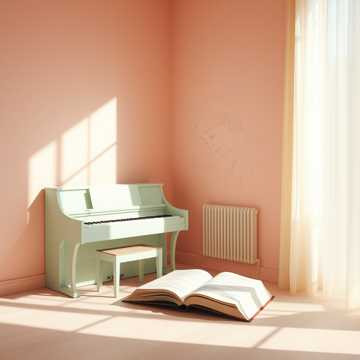 romantic spring afternoon, pastel color atmosphere, dreamy and slightly whimsical feeling, cozy room ambience, light breeze through the window, refined and sweet sound
