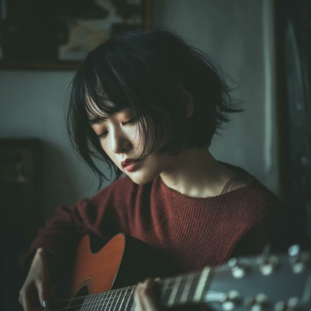 Intimate unplugged acoustic arrangement, Single acoustic guitar with delicate fingerpicking, Slow, floating tempo, slightly behind the beat, Breathy, whispery female vocal with subtle emotional vibrato, Very light harmony only on choruses, Warm analog tone, early morning seaside atmosphere, No percussion, no pads, no effects beyond soft reverb