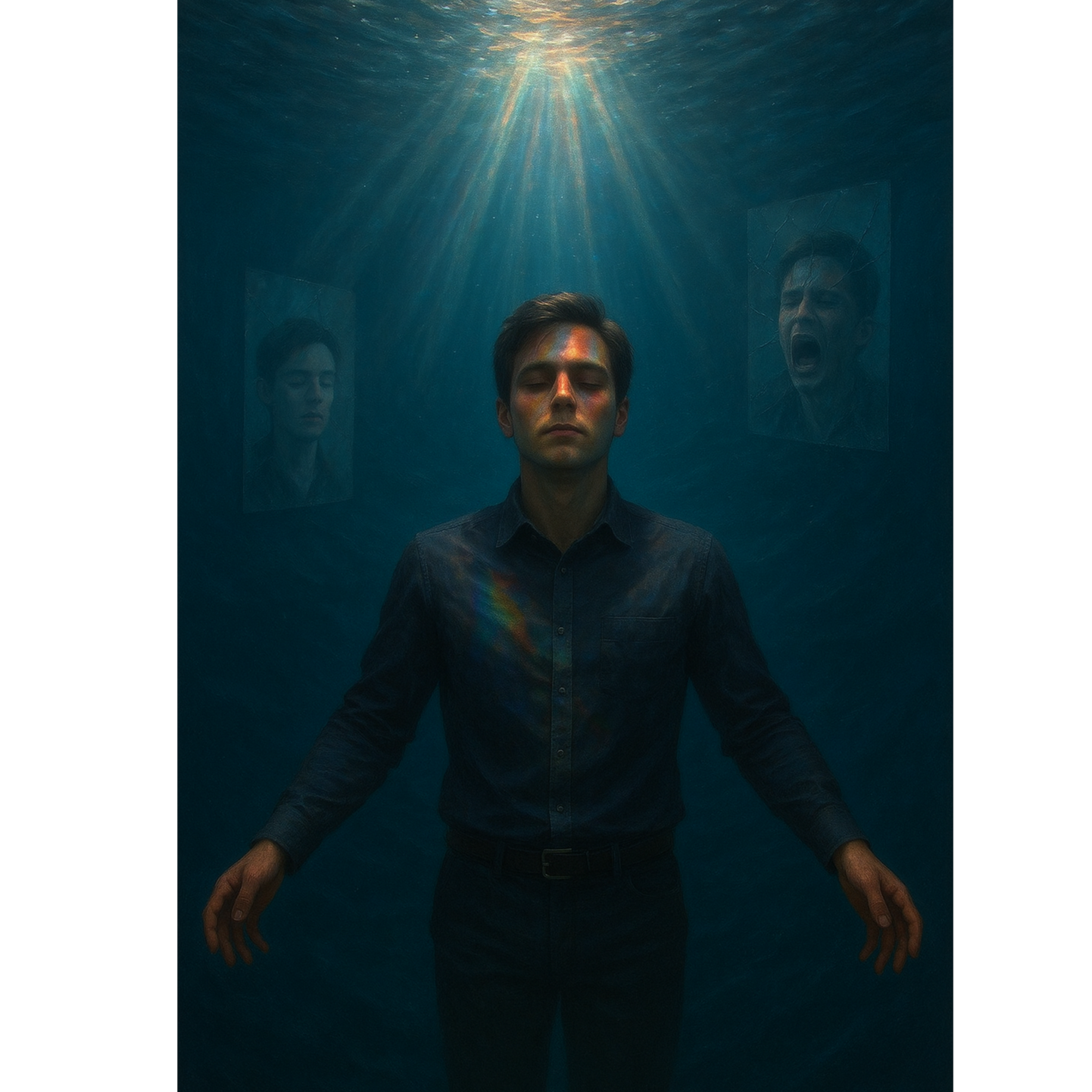Create an emotional, atmospheric deep house track with layered synth textures and a pulsing bassline, The arrangement should evoke a sense of weightlessness and inner tension — like being submerged in a sea of conflicting emotions, Use reverberated vocal chops and melancholic chord progressions to reflect the contradiction between clarity and confusion, Think spacious pads, subtle glitch effects, and warm analog textures, The groove should be steady but hypnotic, with gradual builds and breaks that mirror emotional surges