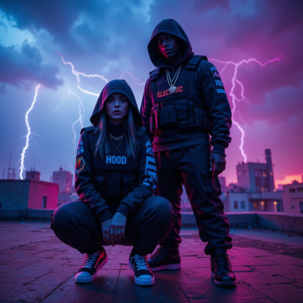 [West Coast G-Funk, cinematic hip-hop] [moog bass, funky electric guitar, vintage synth leads, analog drum machine, cinematic strings, vinyl crackle]