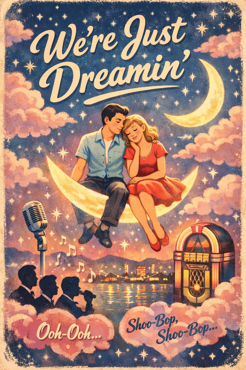 Dream Pop with a soft Doo-Wop swing, warm, melodic, and rhythmic, Use gentle synths or piano for chords, light brushed percussion for a soft bounce, and subtle bass to drive the groove, Female voice, warm, smooth, airy but not shrill, expressive with soft legato phrasing, Include soft vocal harmonies or layered “oohs” and “ahhs” for lush, retro texture, Tempo ~90 bpm with a gentle swing (like Sh-Boom), keeping the song concise and flowing around 3 minutes, Reflective but slightly playful, letting the dreamy, story-like lyrics shine