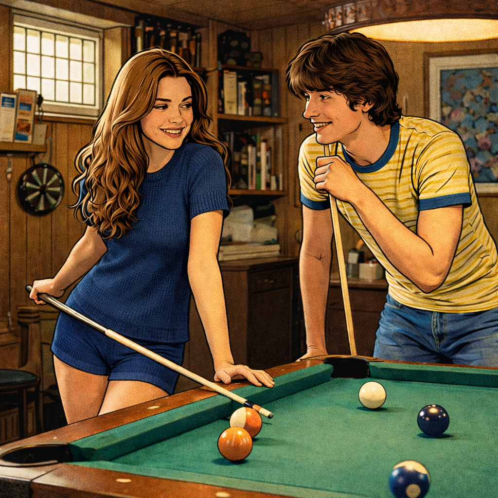 Upbeat 70s pop song, playful teen romance, 120 BPM, electric guitar, bass, drums with snappy snare and handclaps, soft keys, melodic clear vocals, verses with playful tension, catchy sing-along chorus, bridge slightly slower and teasing, outro fade with guitar and handclaps, emotional male vocals British