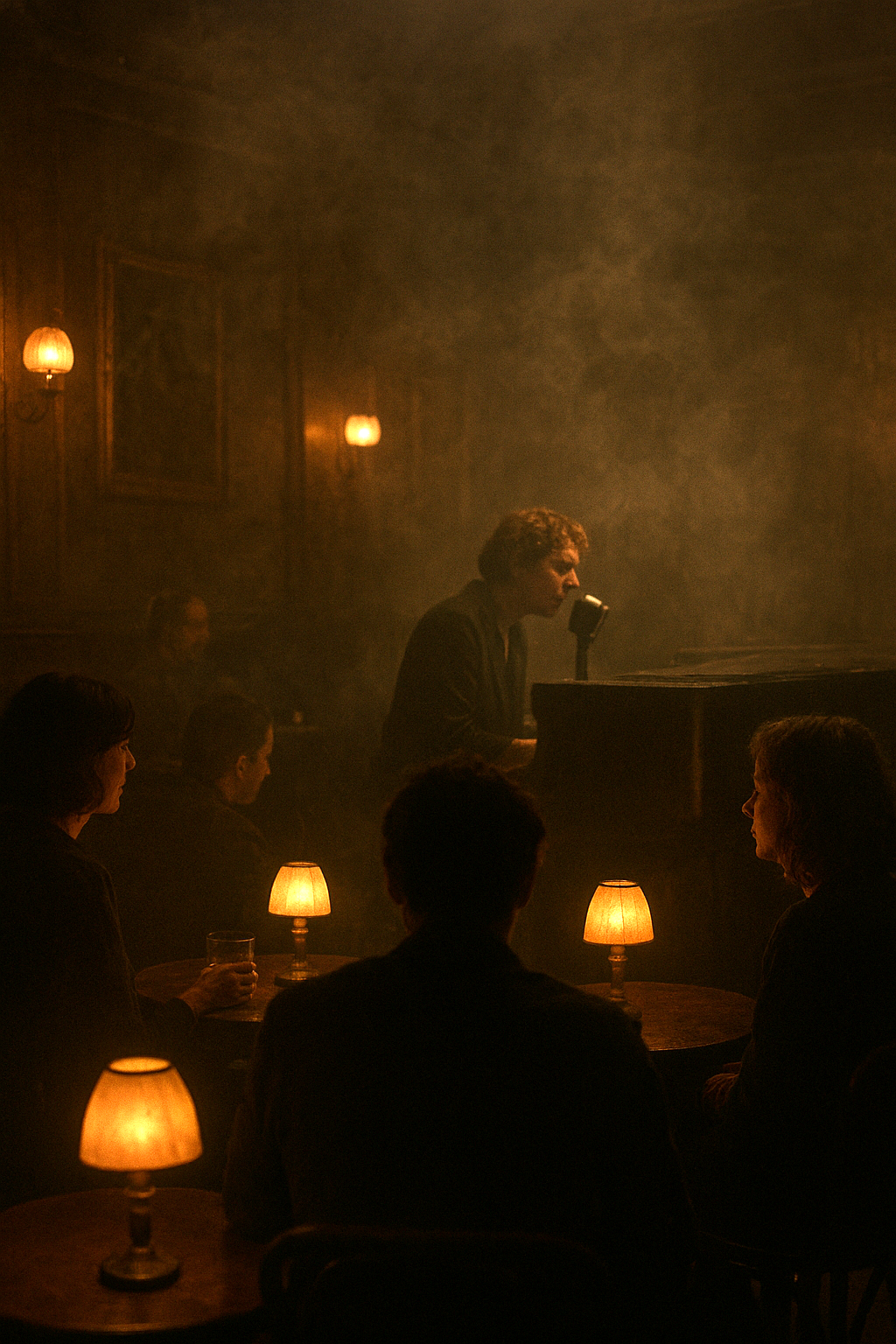 Late-night piano bar ballad, extremely slow and moody, Male vocal only, very low register, gravelly, whiskey-worn, raspy, chest-heavy, world-weary voice, Spoken-sung delivery, uneven, cracked, intimate, close-mic’d, Emphasize pauses and draw out consonants and vowels for growl effect, Sparse upright piano with soft minor chords, brushed drums barely