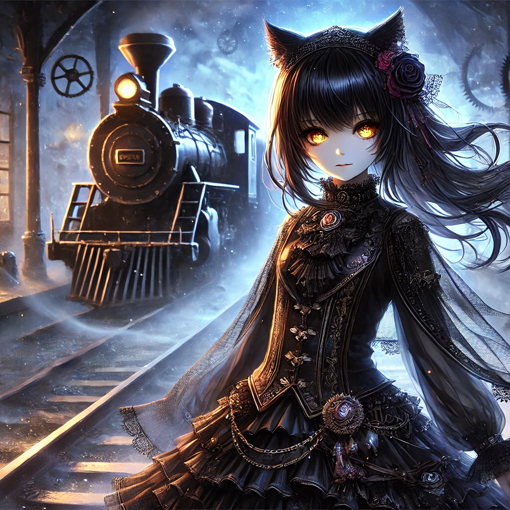 Original concept: A Felis Catus heavy metal track, female vocal, evoking a ghostly train arriving at a deserted platform, Atmosphere mixes gothic, steampunk, and the metallic screech of iron, Style: Heavy Metal × Gothic × Steampunk