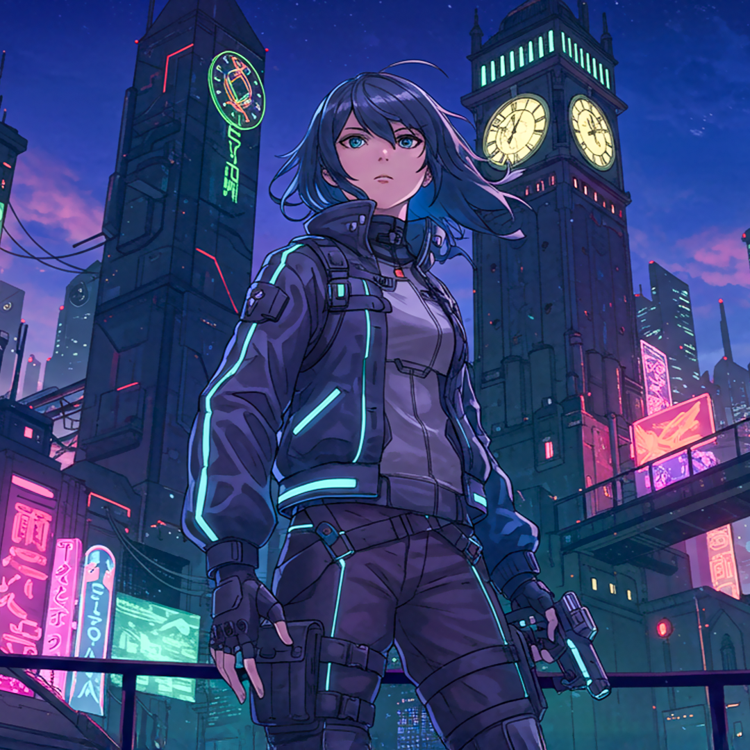 [Clear mix & mastering sound], Stylish, fast-paced jazz rock fused with acid techno, cyberpunk atmosphere, female vocal, driving walking bass, syncopated jazz guitar comps, aggressive 303 acid basslines, tight breakbeat-infused techno drums, and futuristic synth leads, Maintain an urban, cool tone with a sense of urgency, IV–V–iii–vi progression, blending minor-key suspense with bright, energetic hooks, cinematic builds, and percussive stabs for an anime opening about a resistance time-thief