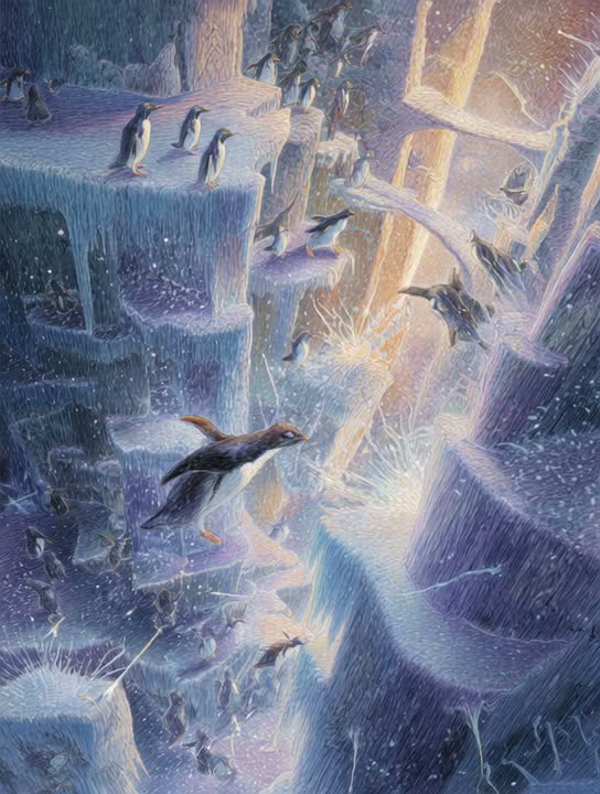 Title: Kyokai "Antarctic War Chronicle", genre: symphonic orchestra with powerful choir, fast tempo with dynamic epic feel, depicting an adventure exploring ancient ice-bound ruins, battles with highly advanced penguins, and the encounter and reconciliation with a gentle Antarctic penguin, with a mystical intro evoking icy caves and cold winds, verses conveying tense battles, pre-chorus expressing hope and warmth, and chorus with grand choir and orchestra creating uplifting momentum, centered on strings, brass, percussion, and choir, with a strong, fast rhythm that tells the story in a 3-4 minute epic main theme