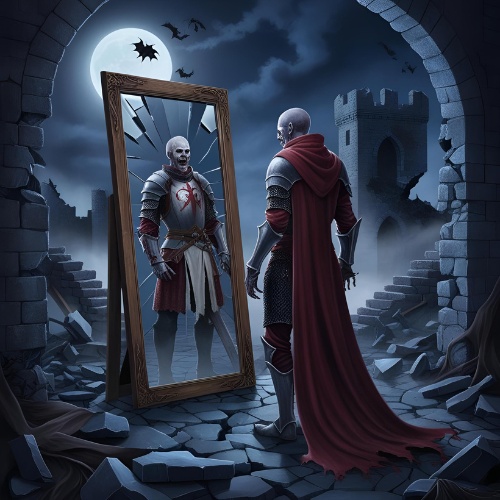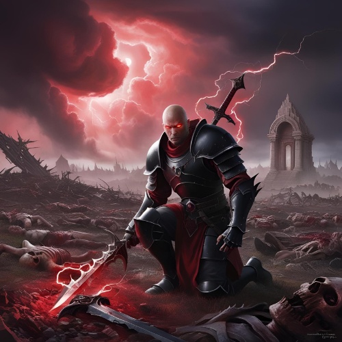 Dark Epic Orchestral, Slow, melancholic strings, deep choirs, mournful brass, heavy war drums, Tempo: 75 BPM, Vocals: Deep, ominous male voice, shifting between spoken prophecy, sorrowful singing