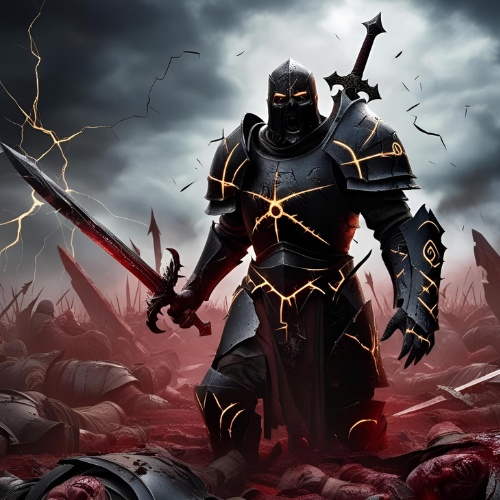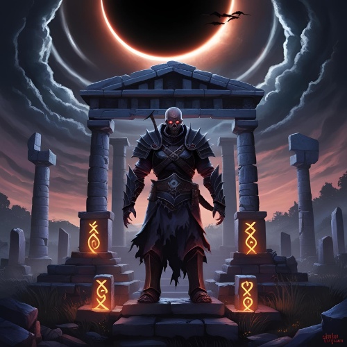 Epic Orchestral Dark Fantasy, Massive A powerful, commanding male voice, Massive orchestration with full string ensemble, powerful brass, battle themes, 6/8, grand and imposing, eerie atmospheric synths