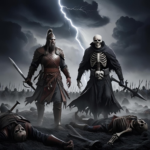 Dark Epic Orchestral, Slow, melancholic strings, deep choirs, mournful brass, heavy war drums, ghostly whispers