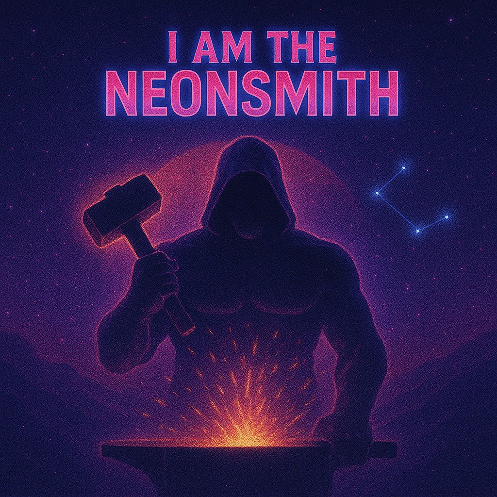 Atmospheric synth-wave intro with deep cosmic narration, Slow pulsing bass, airy pads, and retro arpeggios build tension, A deep, gravelly, but fatherly, cosmic male voice speaks as if transmitting from another universe, telling the myth of the Neonsmith — a voyager of the neon forge who curates transmissions forged in cosmic fire, Minimal percussion, cinematic reverb, and a rising synth swell at the end that transitions naturally into the next track, Spoken word