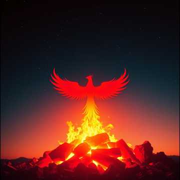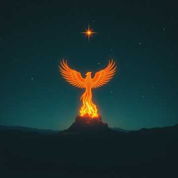 Epic retrowave space rock anthem, Lush synth layers and soaring reverb-drenched guitars create a vast, cosmic soundscape, Steady driving drums build into a euphoric finale, Vocals are emotional and cinematic, carrying themes of rebirth, love, and hope, Triumphant yet bittersweet, like a phoenix rising from fire under a starlit sky, The sound of renewal and culmination, closing a mythic journey